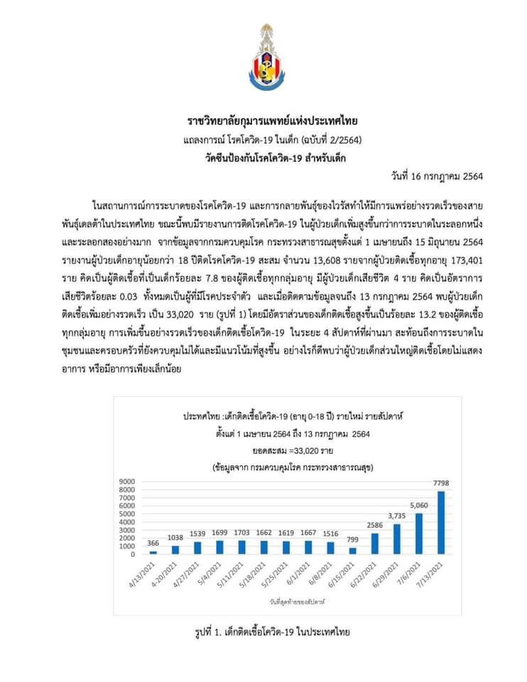 นพ.สมศักดิ์ โล่ห์เลขา ประธานราชวิทยาลัยกุมารแพทย์แห่งประเทศไทย กล่าวถึงแถลงการณ์ โรคโควิด-19 ในเด็ก (ฉบับที่ 2/2564) วัคซีนป้องกันโรคโควิด-19 สำหรับเด็กเพื่อลดความตระหนักในผู้ปกครอง เนื่องจากสถานการณ์การติดเชื้อโควิด -19 ในเด็กยังไม่สูงเท่าผู้ใหญ่ โดยพบเด็กติดเชื้อจากเดลตามากขึ้นเป็น 12-13 % และอัตราการเสียชีวิต 0.03 % ทั้งนี้เพื่อลดความตระหนกในผู้ปกครอง เพราะพ่อแม่รักลูก ย่อมอยากให้ลูกได้รับวัคซีน เป็นเครื่องป้องกัน ยิ่งวัคซีนมีน้อย ก็อยากจะเสียสละให้ลูก แต่หลักฐานทางวิชาการชัดเจนว่า อัตราการแพร่เชื้อในเด็กน้อย เด็กกับเด็กติดเชื้อกันเองแทบไม่มี เด็กไม่ใช่ตัวแพร่เชื้อ