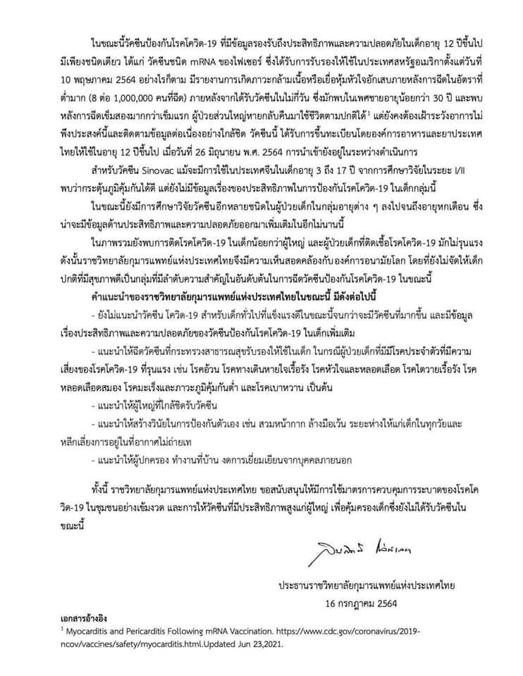 โดยใจความของแถลงการณ์ ระบุคำแนะนำว่ายังไม่แนะนำวัคชีนโควิด-19 สำหรับเด็กทั่วไปที่แข็งแรงดีในขณะนี้จนกว่าจะมีวัคซีนที่มากขึ้น และมีข้อมูลเรื่องประสิทธิภาพและความปลอดภัยของวัคซีนป้องกันโรคโควิด-19 ในเด็กเพิ่มเติม และ แนะนำให้ผู้ใหญ่ที่ใกล้ชิดรับวัคซีน พร้อมสวมหน้ากาก ล้างมือเว้น ระยะห่างให้แก่เด็กในทุกวัยและหลีกเลี่ยงการอยู่ในที่อากาศไม่ถ่ายเท และงดการเยี่ยมเยียนจากบุคคลภายนอก