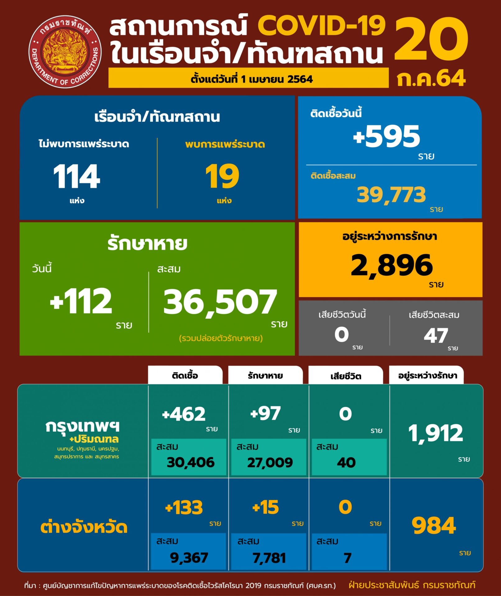 นายอายุตม์ สินธพพันธุ์ อธิบดีกรมราชทัณฑ์ กล่าวถึงสถานการณ์การแพร่ระบาดของโรคติดเชื้อไวรัสโควิด-19 ในเรือนจำและทัณฑสถาน พบผู้ติดเชื้อรายใหม่ 595 ราย หายป่วยเพิ่ม 112 ราย รวมยังมีผู้ต้องขังติดเชื้อที่อยู่ในการดูแลของกรมราชทัณฑ์ 2,896 รายไม่มีรายงานผู้เสียชีวิตต่อเนื่องเป็นวันที่ 10 วันนี้มีเรือนจำสีแดงที่พบการแพร่ระบาดเพิ่มขึ้น 1 แห่ง คือ เรือนจำกลางปัตตานี พบผู้ต้องขังแดนในติดเชื้อ ส่งผลให้ขณะนี้จำนวนเรือนจำสีแดงเพิ่มเป็น 19 แห่ง โดยผู้ติดเชื้อรายใหม่พบในเรือนจำสีแดง 536 ราย และพบในห้องแยกกักโรคผู้ต้องขังรับใหม่ 59 ราย