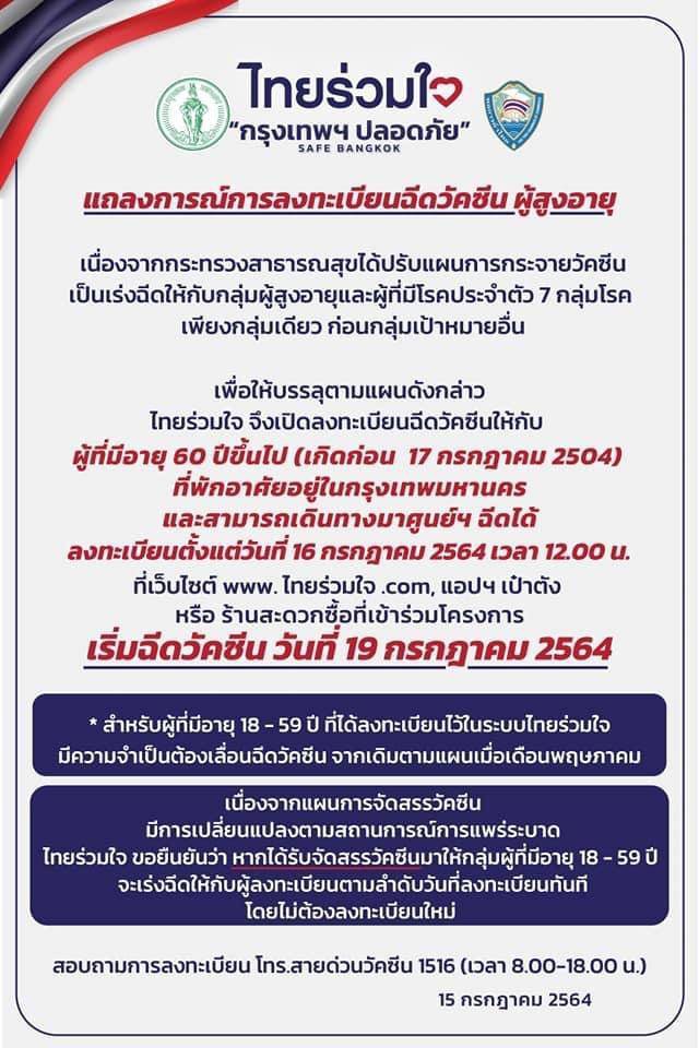 และเริ่มฉีดวัคซีนเมื่อวันที่ 19 ก.ค.64 ณ หน่วยความร่วมมือบริการฉีดวัคซีนโควิด-19 กรุงเทพมหานคร – หอการค้าไทย ทั้ง 25 จุด กทม.จึงขอเชิญชวนผู้ที่มีอายุ 60 ปีขึ้นไป (เกิดก่อน 17 ก.ค.2504) สัญชาติไทย และพักอาศัยอยู่ในกรุงเทพฯ สามารถเดินทางมายังสถานที่ฉีดวัคซีนได้ ลงทะเบียนเพื่อนัดหมายฉีดวัคซีนได้ตั้งแต่บัดนี้ .-สำนักข่าวไทย