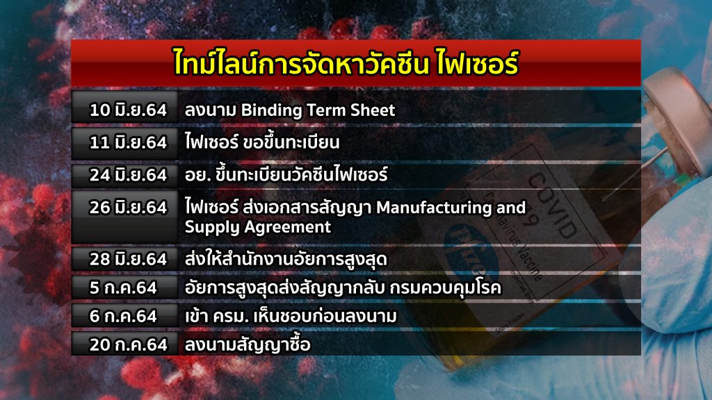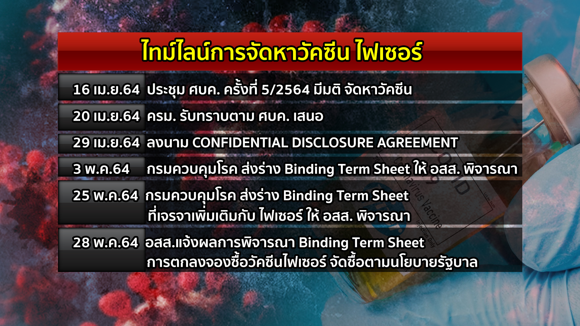 เริ่มตั้งต้นตั้งแต่วันที่ 16 เมษายน ศบค. มีมติจัดหาไฟเซอร์ ส่งมติให้คณะรัฐมนตรีรับทราบในวันที่ 20 เมษายน และได้มีการลงนาม CONFIDENTIAL DISCLOSURE AGREEMENT ในวันที่ 29 เดือนเดียวกัน จากนั้น วันที่ 3 พฤษภาคม กรมควบคุมโรค ส่งร่าง Binding Term Sheet ให้อัยการสูงสุดพิจารณา ต่อมาวันที่ 25 พฤษภาคม กรมควบคุมโรคได้ส่งร่าง Binding Term Sheet ที่เจรจาเพิ่มเติมกับไฟเซอร์ให้อัยการสูงสุดพิจารณา