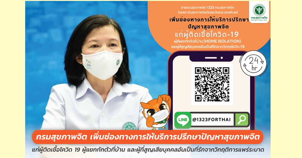กรมสุขภาพจิตได้ติดตามและให้ความสำคัญกับกลุ่มต่างๆ ข้างต้นเป็นอย่างมาก จึงดำเนินการเพิ่มเติมช่องทางการให้บริการปรึกษาปัญหาสุขภาพจิตสำหรับประชาชนในกลุ่มผู้ติดเชื้อโควิด 19 ผู้แยกกักตัวที่บ้าน (Home isolation)/กักตัวในชุมชน (Community isolation) และผู้ที่สูญเสียบุคคลอันเป็นที่รักจากวิกฤติการแพร่ระบาด ผ่าน LINE @1323FORTHAI ควบคู่ไปกับระบบสายด่วนสุขภาพจิต 1323 ที่มีอยู่เดิม และกรมสุขภาพจิตยังขอเชิญชวนให้พี่น้องประชาชนที่ติดเชื้อโควิด 19 หรือกำลังแยกกักตัว หรือสูญเสียบุคคลในครอบครัวที่ท่านรัก ให้ประเมินสุขภาพจิตของตนเองอย่างสม่ำเสมอด้วยแพลตฟอร์ม Mental Health Check In เพื่อให้ทราบว่าตนเองกำลังมีความเสี่ยงต่อปัญหาความเครียด ซึมเศร้า หรือฆ่าตัวตาย ในระดับใด เพื่อเข้าสู่ระบบการดูแลรักษาด้านสุขภาพจิตได้อย่างรวดเร็วต่อไป