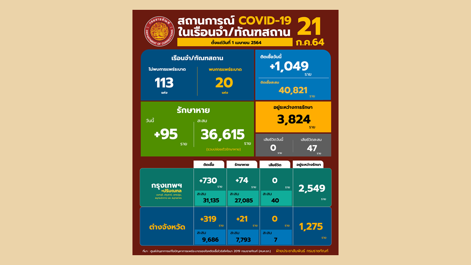 นายอายุตม์ สินธพพันธุ์ อธิบดีกรมราชทัณฑ์ กล่าวถึงสถานการณ์การแพร่ระบาดของโรคติดเชื้อไวรัสโควิด-19 ในเรือนจำและทัณฑสถานพบผู้ติดเชื้อรายใหม่ 1,049 ราย โดยพบในเรือนจำสีแดง 1,015 รายและพบในห้องแยกกักโรคผู้ต้องขังรับใหม่ 34 รายหายป่วยเพิ่ม 95 ราย รวมยังมีผู้ต้องขังติดเชื้อที่อยู่ในการดูแลของกรมราชทัณข์ 3,824 ราย และไม่มีรายงานผู้เสียชีวิตต่อเนื่องเป็นวันที่ 11
