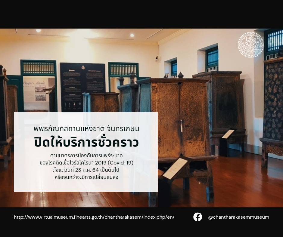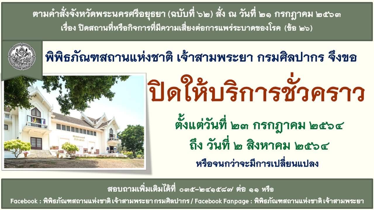 - ให้แหล่งเรียนรู้ในสังกัดกรมศิลปากรดังต่อไปนี้ที่ตั้งอยู่ในจังหวัดที่กําหนดเป็นพื้นที่ควบคุม สูงสุดและเข้มงวด ตามคําสั่งศูนย์บริหารสถานการณ์แพร่ระบาดของโรคติดเชื้อไวรัสโคโรนา 2019 (โควิด-19) ที่10/2564 เรื่องพื้นที่สถานการณ์ที่กําหนดเป็นพื้นที่ควบคุมสูงสุดและเข้มงวด พื้นที่ควบคุมสูงสุด พื้นที่ควบคุมและพื้นที่เฝ้าระวังสูง ตามข้อกําหนดออกตามความในมาตรา 9 แห่งพระราชกําหนดการบริหารราชการในสถานการณ์ฉุกเฉิน พ.ศ.2558 ลงวันที่ 17 กรกฎาคม พ.ศ.2564 ปิดการให้บริการเป็นการชั่วคราวระหว่างวันที่ 22 กรกฎาคม 2564-วันที่ 2 สิงหาคม 2564 ยกเว้นแหล่งเรียนรู้ในสังกัดกรมศิลปากรที่ตั้งอยู่ในพื้นที่กรุงเทพมหานครให้ปิดบริการเป็นการชั่วคราวระหว่างวันที่ 20 กรกฎาคม – วันที่ 2 สิงหาคม 2564