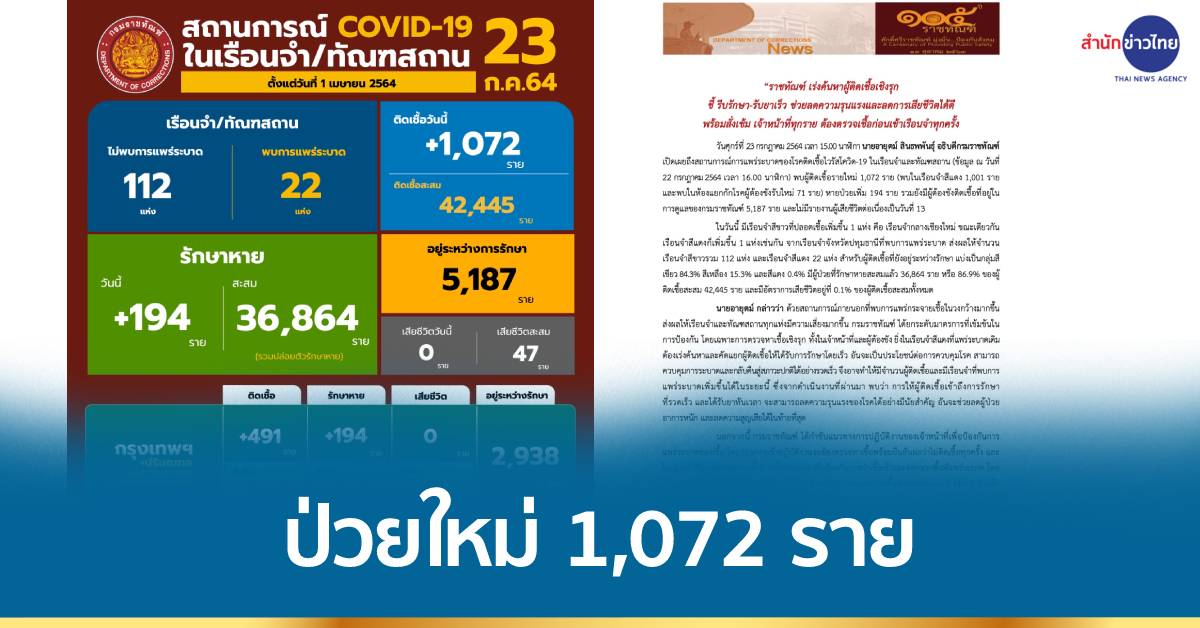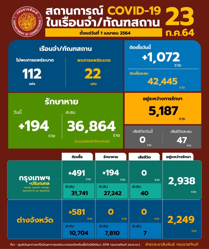 นายอายุตม์ สินธพพันธุ์ อธิบดีกรมราชทัณฑ์ เปิดเผยถึงสถานการณ์การแพร่ระบาดของโรคติดเชื้อไวรัสโควิด-19 ในเรือนจำและทัณฑสถาน (ข้อมูล ณ วันที่ 22 กรกฎาคม 2564 เวลา 16.00 นาฬิกา) พบผู้ติดเชื้อรายใหม่ 1,072 ราย (พบในเรือนจำสีแดง 1,001 ราย และพบในห้องแยกกักโรคผู้ต้องขังรับใหม่ 71 ราย) หายป่วยเพิ่ม 194 ราย รวมยังมีผู้ต้องขังติดเชื้อที่อยู่ใน การดูแลของกรมราชทัณฑ์ 5,187 ราย และไม่มีรายงานผู้เสียชีวิตต่อเนื่องเป็นวันที่ 13