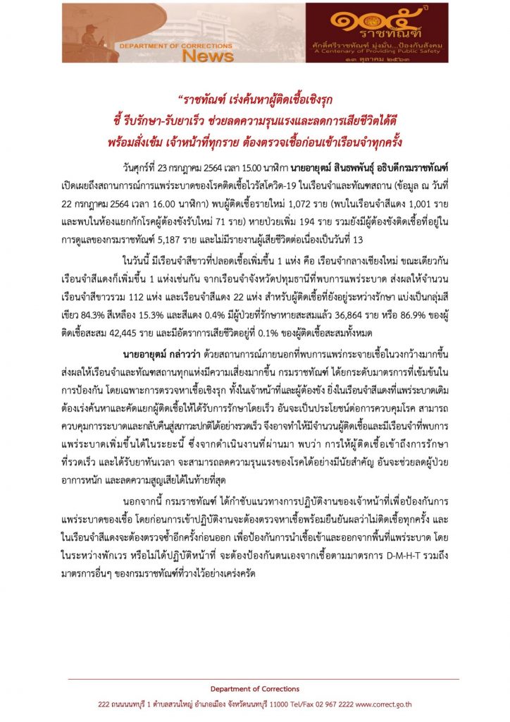 กทม. 23 ก.ค.-ราชทัณฑ์ พบผู้ติดเชื้อรายใหม่ 1,072 ราย เร่งค้นหาผู้ติดเชื้อเชิงรุก ชี้รีบรักษา-รับยาเร็ว ช่วยลดความรุนแรงและลดการเสียชีวิตได้ดี