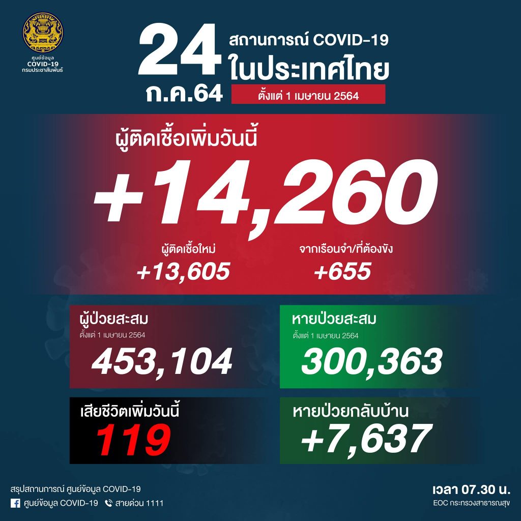 EOC กระทรวงสาธารณสุข รายงานสถานการณ์การติดเชื้อโควิด-19 รายใหม่ วันนี้ (24 ก.ค.) พบยอดผู้ติดเชื้อใหม่รวม 14,260 ราย จำแนกเป็นติดเชื้อใหม่ 13,605 ราย ติดเชื้อภายในเรือนจำ/ที่ต้องขัง 655 ราย ยืนยันสะสม 453,104 ราย (ตั้งแต่ 1 เมษายน) หายป่วยกลับบ้าน 7,637 ราย มีผู้เสียชีวิตเพิ่ม 119 ราย .-สำนักข่าวไทย