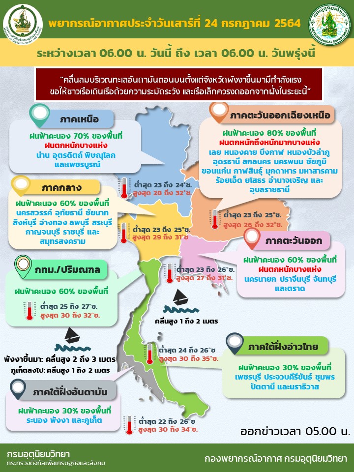กทม. 24 ก.ค.-กรมอุตุนิยมวิทยา เตือน “เหนือ ตะวันออก อีสาน” ระวังฝนตกหนัก น้ำป่าไหลหลาก กรุงเทพฯ – ปริมณฑล เจอฝนร้อยละ 60 ส่วนทะเลอันดามันตอนบนคลื่นสูง 2-3 เมตร