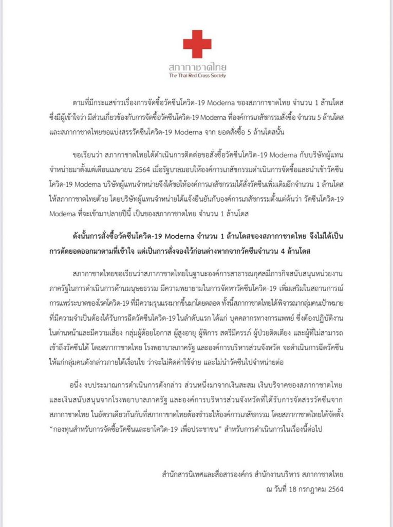 นายเตช บุนนาค เลขาธิการสภากาชาดไทยกล่าวว่า สภากาชาดไทยพิจารณาจัดสรรวัคซีนโมเดอร์นาให้องค์การบริหารส่วนจังหวัด (อบจ.) สั่งจองยังสำนักบริหารกิจการเหล่ากาชาดเข้ามาแล้ว รวม 38 จังหวัด ประกอบด้วย อบจ. นนทบุรี ปทุมธานี สมุทรปราการ เชียงใหม่ ชลบุรี ราชบุรี อุดรธานี สระบุรี มหาสารคาม สิงห์บุรี ลำพูน กระบี่ แพร่ สมุทรสาคร เพชรบูรณ์ นครปฐม ร้อยเอ็ด นครนายก พะเยา กาฬสินธุ์ พระนครศรีอยุธยา น่าน นราธิวาส ศรีสะเกษ สุพรรณบุรี อุทัยธานี เชียงราย สุโขทัย อ่างทอง ภูเก็ต อุตรดิตถ์ มุกดาหาร ตาก ชุมพร พังงา ลพบุรี สุรินทร์ และปัตตานี