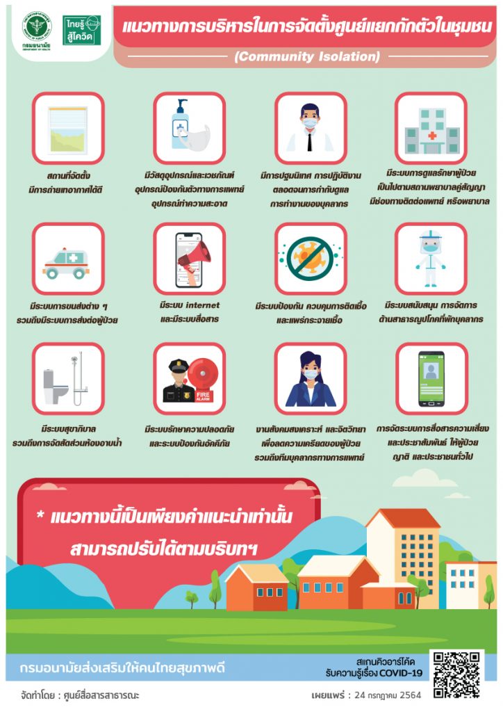 นายแพทย์อรรถพล แก้วสัมฤทธิ์ รองอธิบดีกรมอนามัย กล่าวว่า จากนโยบายรัฐมนตรีช่วยว่าการกระทรวงสาธารณสุข (ดร.สาธิต ปิตุเตชะ) ที่มีความห่วงใยและให้ความสำคัญต่อการจัดตั้งศูนย์แยกกักตัวในชุมชน (Community Isolation) โดยมอบให้กรมอนามัยเป็นผู้ประสานงานของศูนย์ความร่วมมือภาครัฐและประชาสังคม เตรียมความพร้อมของท้องถิ่น ชุมชน และหน่วยงานที่เกี่ยวข้อง ก่อนจัดตั้งศูนย์แยกกักตัวในชุมชนเพื่อให้ความรู้เรื่องการจัดการอนามัยสิ่งแวดล้อม สิ่งปฏิกูล มูลฝอยติดเชื้อ สนับสนุนวัสดุอุปกรณ์ในการทำความสะอาด และจัดการสิ่งแวดล้อมเบื้องต้น การสร้างความรอบรู้เรื่องความเสี่ยงและการดูแลสุขลักษณะระหว่างที่อยู่ในศูนย์แยกกักตัวในชุมชน ส่งเสริมด้านโภชนาการ กิจกรรมทางกาย และจัดการอารมณ์ระหว่างเข้าศูนย์แยกกักตัวในชุมชน
