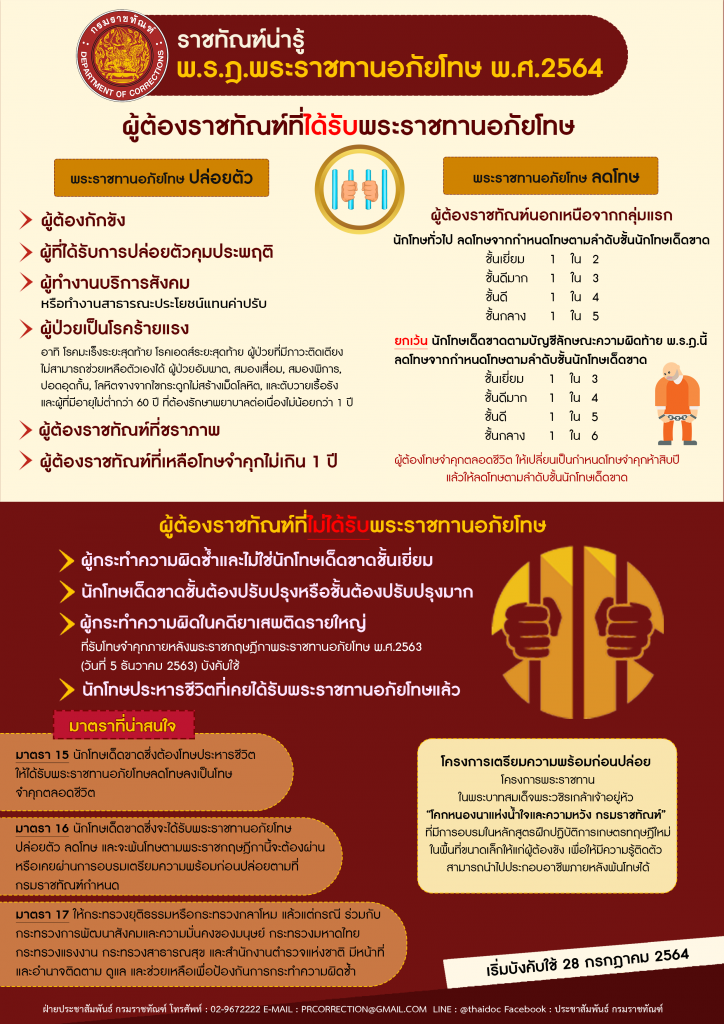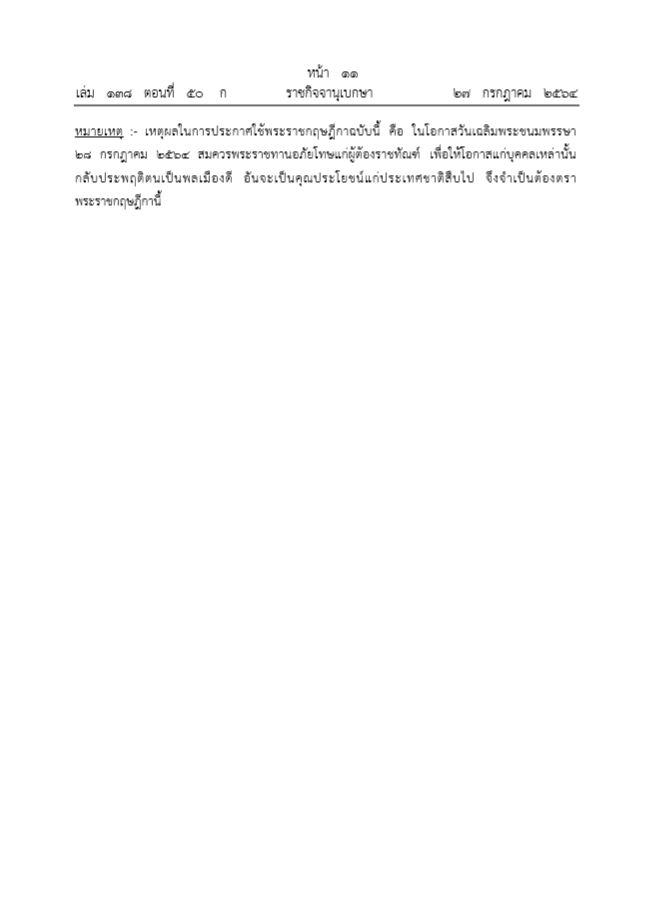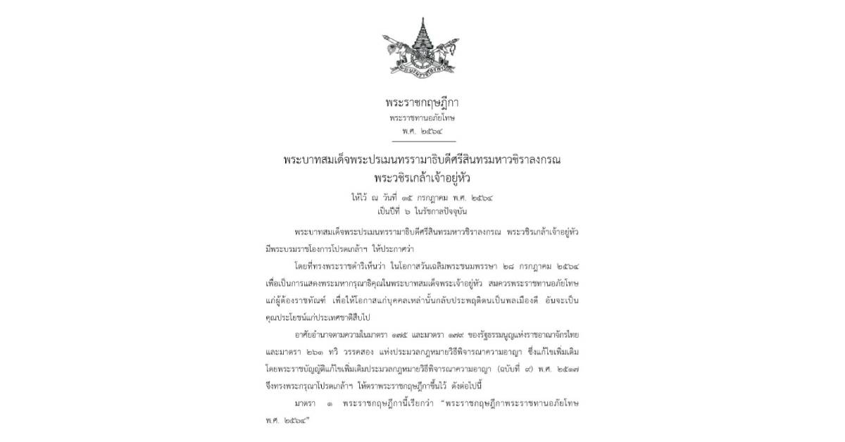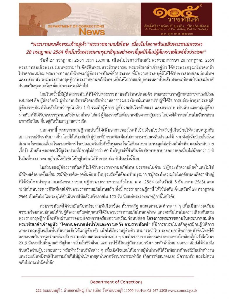 วันที่ 27 กรกฎาคม 2564 เวลา 13.00 น. เนื่องในโอกาสวันเฉลิมพระชนมพรรษา 28 กรกฎาคม 2564 พระบาทสมเด็จพระปรเมนทรรามาธิบดีศรีสินทรมหาวชิราลงกรณ พระวชิรเกล้าเจ้าอยู่หัว ทรงพระกรุณาโปรดเกล้าโปรดกระหม่อม พระราชทานอภัยโทษแก่ผู้ต้องราชทัณฑ์ทั่วประเทศ ที่มีความประพฤติดีให้ได้รับการลดหย่อนผ่อนโทษและปล่อยตัว ตามพระราชกฤษฎีกาพระราชทานอภัยโทษ เพื่อให้โอกาสแก่บุคคลเหล่านั้นกลับประพฤติตนเป็นพลเมืองดี อันจะเป็นคุณประโยชน์แก่ประเทศชาติสืบไป