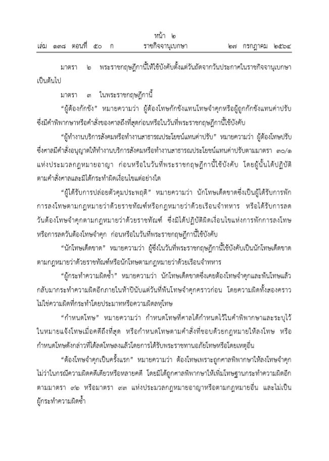 ในส่วนของผู้ต้องราชทัณฑ์ที่ไม่ได้รับพระราชทานอภัยโทษ ประกอบไปด้วย 1) ผู้กระทำความผิดซ้ำและมิใช่นักโทษเด็ดขาดชั้นเยี่ยม 2) นักโทษเด็ดขาดชั้นต้องปรับปรุงหรือชั้นต้องปรับปรุงมาก 3) ผู้กระทำความผิดในคดียาเสพติดรายใหญ่ ที่ได้รับโทษจำคุกภายหลังพระราชกฤษฎีกาพระราชทานอภัยโทษ พ.ศ. 2564 (เมื่อวันที่ 5 ธันวาคม 2563) และ 4) นักโทษประหารชีวิตที่เคยได้รับพระราชทานอภัยโทษแล้ว ทั้งนี้ พระราชกฤษฎีกานี้ให้ใช้บังคับตั้งแต่วันที่ 28 กรกฎาคม 2564 เป็นต้นไป โดยระบุให้ดำเนินการให้แล้วเสร็จภายใน 120 วัน นับแต่พระราชกฤษฎีกานี้ใช้บังคับ