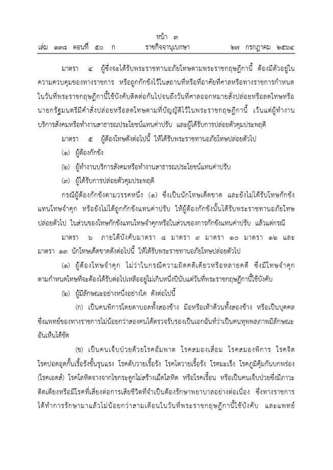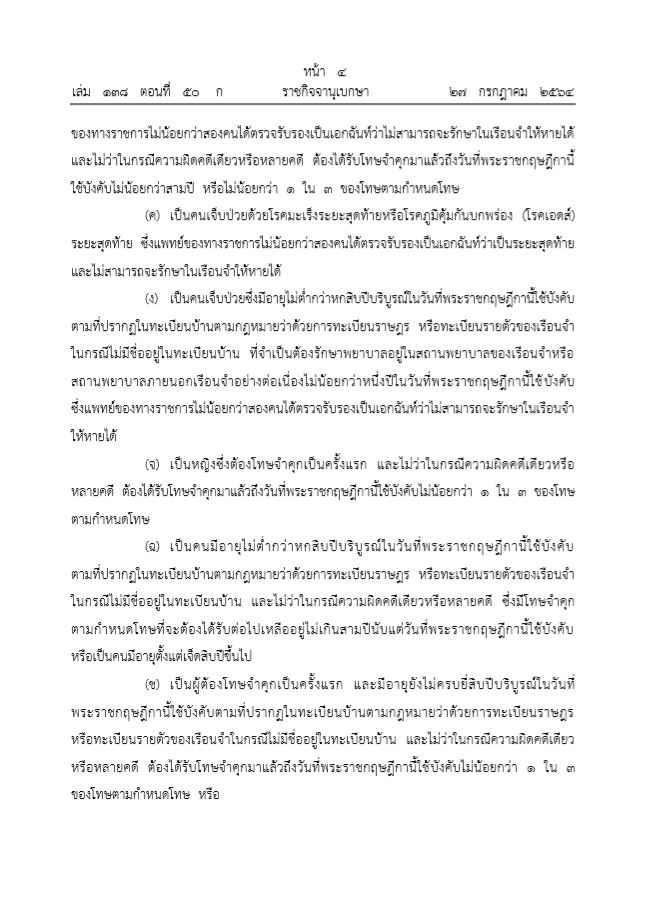 นอกจากนี้ พระราชกฤษฎีกาฉบับนี้ได้เพิ่มอาการของโรคที่เป็นเงื่อนไขสำหรับผู้เจ็บป่วยให้ครอบคลุมกับสภาวการณ์ปัจจุบันมากขึ้น โดยได้เพิ่มเติมถึงผู้ป่วยที่มีภาวะติดเตียง ไม่สามารถช่วยเหลือตัวเองได้ รวมทั้งผู้เจ็บป่วยด้วยโรคอัมพาต โรคสมองเสื่อม โรคสมองพิการ โรคปอดอุดกั้นเรื้อรังขั้นรุนแรง โรคโลหิตจางจากไขกระดูกไม่สร้างเม็ดโลหิต และโรคตับวายเรื้อรัง เป็นต้น ตลอดจนให้ผู้เจ็บป่วยที่มีอายุไม่ต่ำกว่า 60 ปีบริบูรณ์ ที่จำเป็นต้องรักษาพยาบาลอย่างต่อเนื่องไม่น้อยกว่า 1 ปี ในวันที่พระราชกฤษฎีกานี้ใช้บังคับ ให้อยู่ในข่ายได้รับการปล่อยตัวในครั้งนี้ด้วย