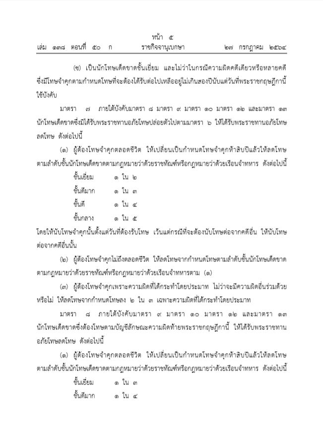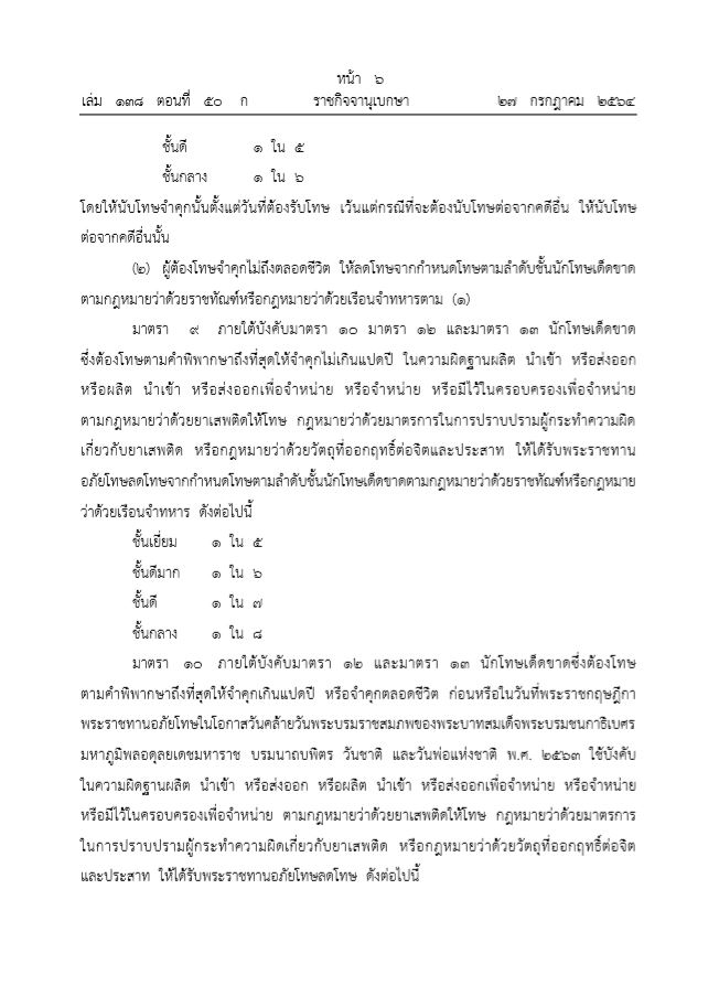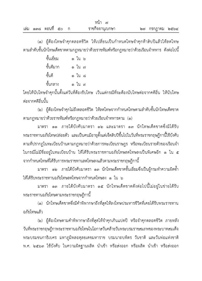 กรุงเทพฯ 27 ก.ค. – พระบาทสมเด็จพระเจ้าอยู่หัว โปรดเกล้าฯ พระราชทานอภัยโทษ เนื่องในโอกาสวันเฉลิมพระชนมพรรษา 28 กรกฎาคม 2564 ซึ่งนับเป็นพระมหากรุณาธิคุณอย่างหาที่สุดมิได้แก่ผู้ต้องราชทัณฑ์ทั่วประเทศ