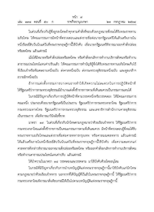 กรมราชทัณฑ์ ได้ร่วมมือกับหน่วยงานที่เกี่ยวข้อง ทั้งภาครัฐ และเอกชน องค์กรต่างๆ เพื่อเป็นการเตรียมความพร้อมก่อนปล่อยให้กับผู้ต้องราชทัณฑ์ทุกคนที่ได้รับพระราชทานอภัยโทษ ลดโทษ และจะพ้นโทษในคราวเดียวกันตามพระราชกฤษฎีกานี้ จะต้องผ่านการอบรมโครงการเตรียมความพร้อมก่อนปล่อย โครงการพระราชทานในพระบาทสมเด็จพระวชิรเกล้าเจ้าอยู่หัว “โคกหนองนาแห่งน้ำใจและความหวัง กรมราชทัณฑ์” ที่มีการอบรมในหลักสูตรฝึกปฏิบัติการเกษตรทฤษฎีใหม่ในพื้นที่ขนาดเล็กให้แก่ผู้ต้องขัง เพื่อให้มีความรู้ติดตัว สามารถนำไปประกอบอาชีพภายหลังพ้นโทษได้ ตลอดจนเป็นการเตรียมพร้อมรับความเปลี่ยนแปลงทางด้านต่างๆ รวมถึงสถานการณ์การแพร่ระบาดของโรคติดเชื้อไวรัสโคโรนา 2019 อันจะเป็นพื้นฐานสำคัญในการเริ่มต้นชีวิตใหม่ และการใช้ชีวิตอยู่กับครอบครัวภายหลังพ้นโทษ นอกจากนี้ ยังได้ร่วมมือกับเครือข่ายผู้ประกอบการ หรือห้างร้านบริษัทต่างๆ เพื่อเปิดใจและให้โอกาสผู้พ้นโทษที่ได้รับพัฒนาทักษะฝีมือเข้าทำงาน และร่วมเป็นหนึ่งพลังในการผลักดันให้ผู้พ้นโทษหลุดพ้นจากวังวนการกระทำผิด เกิดการพัฒนาตนเอง มีความหวัง และไม่หวนกลับไปกระทำผิดซ้ำอีก. – สำนักข่าวไทย