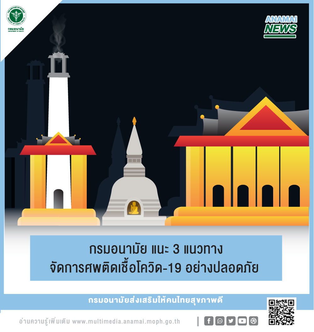 นพ.สุวรรณชัย วัฒนายิ่งเจริญชัย อธิบดีกรมอนามัย เปิดเผยว่า จากสถานการณ์การแพร่ระบาดของโรคโควิด-19 ส่งผลให้มีผู้ติดเชื้อเป็นจำนวนมาก รวมถึงจำนวนผู้เสียชีวิตที่เพิ่มมากขึ้นอย่างต่อเนื่อง นับเป็นความสูญเสียที่กรมอนามัยต้องขอแสดงความเสียใจกับทุกครอบครัวที่ได้รับผลกระทบและสูญเสียสมาชิกไปด้วยโรคโควิด-19 ดังนั้น การจัดการศพผู้ที่เสียชีวิตจากโรคโควิด-19 อย่างปลอดภัย กรมอนามัย มีคำแนะนำ 3 แนวทาง ดังนี้