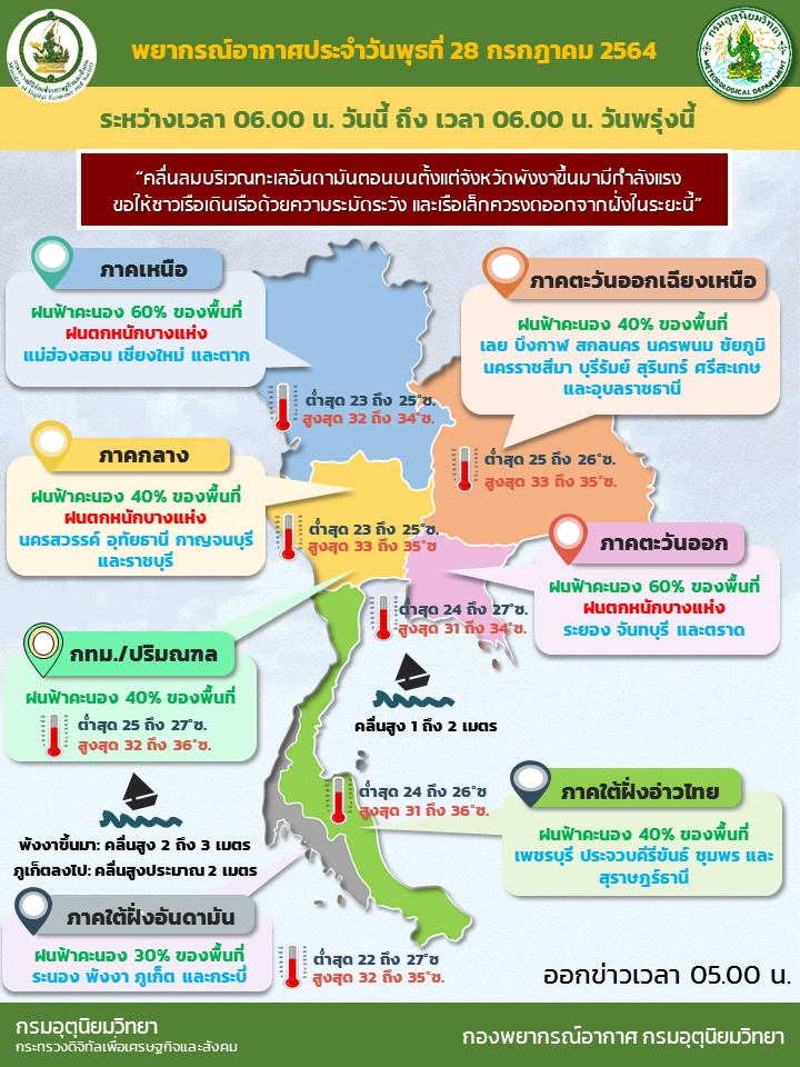 กรมอุตุนิยมวิทยา พยากรณ์อากาศ 24 ชั่วโมงข้างหน้า ร่องมรสุมพาดผ่านประเทศเมียนมา ตอนบนของภาคเหนือ ประเทศลาว และเวียดนามตอนบน ประกอบกับมรสุมตะวันตกเฉียงใต้ที่พัดปกคลุมทะเลอันดามัน ประเทศไทย และอ่าวไทยยังคงมีกำลังแรง ลักษณะเช่นนี้ทำให้ประเทศไทยยังคงมีฝนตกหนักบางแห่งในภาคเหนือ ภาคกลาง และภาคตะวันออก ขอให้ประชาชนบริเวณดังกล่าวระวังอันตรายจากฝนที่ตกหนักและฝนที่ตกสะสม ซึ่งอาจทำให้เกิดน้ำท่วมฉับพลันและน้ำป่าไหลหลากได้