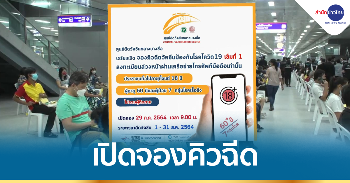 กรุงเทพฯ 28 ก.ค.-ศูนย์ฉีดวัคซีนกลางบางซื่อ เปิดจองคิวนัดหมายฉีดวัคซีนโควิด-19 แก่ผู้มีอายุ 18 ปีขึ้นไป ผู้สูงอาย 60 ปีขึ้นไป และ 7 กลุ่มโรค ผ่าน 4 ค่ายมือถือ ลงทะเบียน 29 ก.ค.64 เริ่มฉีด 1-31 ส.ค.64
