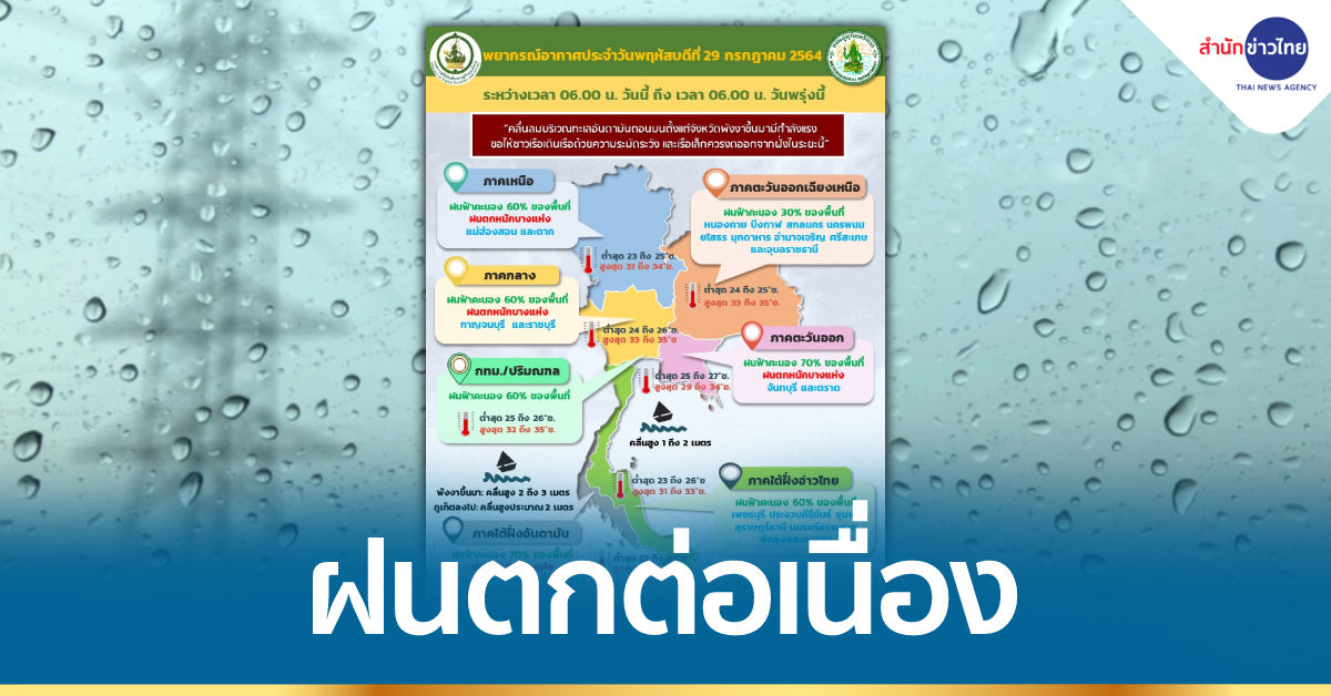 กรมอุตุนิยมวิทยา พยากรณ์อากาศ 24 ชั่วโมงข้างหน้า ร่องมรสุมพาดผ่านประเทศเมียนมา ตอนบนของภาคเหนือ ประเทศลาว และเวียดนามตอนบน ประกอบกับมรสุมตะวันตกเฉียงใต้ที่พัดปกคลุมทะเลอันดามัน ประเทศไทย และอ่าวไทยยังคงมีกำลังแรง ลักษณะเช่นนี้ทำให้ประเทศไทยมีฝนตกหนักบางแห่งในภาคเหนือ ภาคกลาง ภาคตะวันออก และภาคใต้ฝั่งตะวันตก ขอให้ประชาชนบริเวณดังกล่าวระวังอันตรายจากฝนที่ตกหนักและฝนที่ตกสะสม ซึ่งอาจทำให้เกิดน้ำท่วมฉับพลัน และน้ำป่าไหลหลากได้