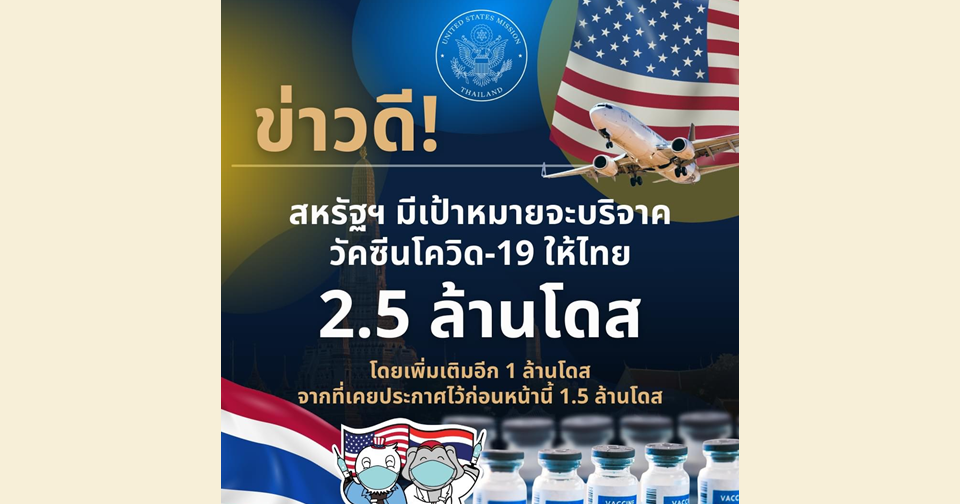 กรุงเทพฯ 29 ก.ค.- เพจสถานทูตสหรัฐฯ โพสต์ข้อความ เตรียมส่งมอบวัคซีนโควิด อย่างน้อย 1.5 ล้านโดส และมีเป้าหมายบริจาครวม 2.5 ล้านโดส
