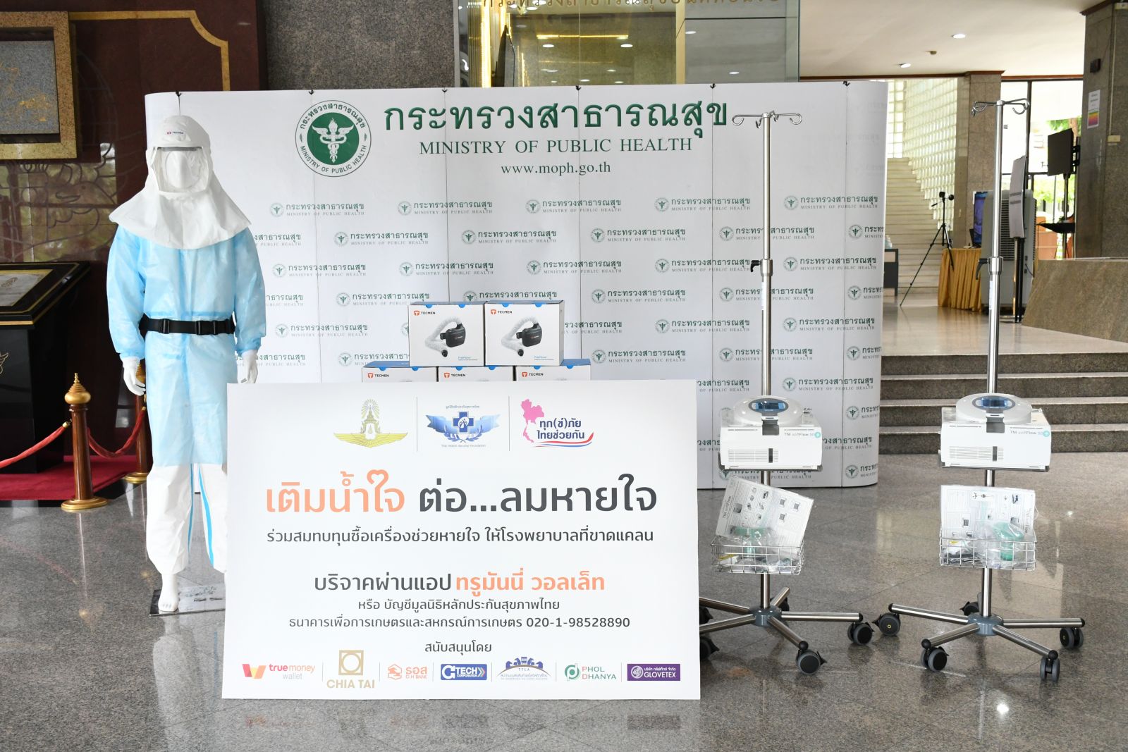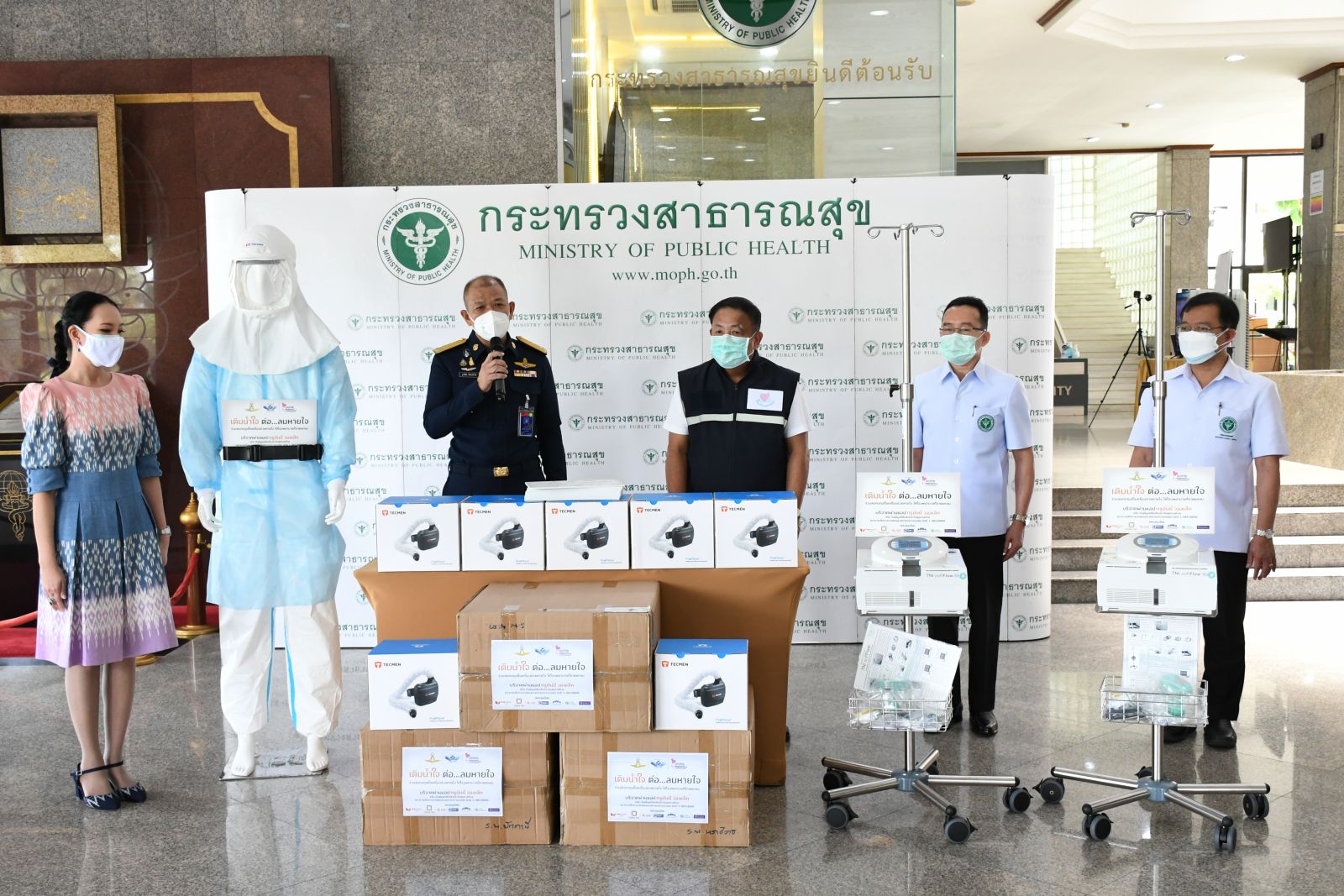 วันนี้ (29 ก.ค.) ที่กระทรวงสาธารณสุข จ.นนทบุรี นพ.เกียรติภูมิ วงศ์รจิต ปลัดกระทรวงสาธารณสุข พร้อมด้วยคณะผู้บริหารกระทรวงสาธารณสุข รับมอบเครื่องช่วยหายใจชนิด High Flow จำนวน 12 เครื่อง อุปกรณ์ปกป้องทางเดินหายใจแบบจ่ายอากาศบริสุทธิ์ หรือ PAPR จำนวน 7 เครื่อง ชุดอุปกรณ์ป้องกันส่วนบุคคล PPE จำนวน 300 ชุด และหน้ากากอนามัย N95 จำนวน 3,000 ชิ้น รวมมูลค่า 2,744,000 บาท จากพลอากาศโท ฐานัตถ์ จันทร์อำไพ เจ้ากรมกิจการพลเรือนทหารอากาศและโฆษกกองทัพอากาศ นพ.ประจักษวิช เล็บนาค ประธานมูลนิธิหลักประกันสุขภาพไทย คุณโกมล เมฆวัฒนา ประธานโครงการทุก(ข์)ภัยไทยช่วยกัน และคณะผู้สนับสนุน ได้แก่ บริษัท เจียไต๋ จำกัด, บริษัท แอสเซนด์ มันนี่ จำกัด หรือ ทรู มันนี่ วอลเล็ท, ธนาคารอาคารสงเคราะห์, สมาคมขนส่งสินค้าและโลจิสติกส์ไทย, บริษัท จีเทค คอร์ปอเรชั่น จำกัด, บริษัท ผลธัญญะ จำกัด มหาชน และ บริษัท กลัฟเท็กซ์ จำกัด มอบให้กับโรงพยาบาลสังกัดกระทรวงสาธารณสุข 6 แห่ง โรงพยาบาลภูมิพลอดุลยเดช โรงพยาบาลเจริญกรุงประชารักษ์ และสำนักงานหลักประกันสุขภาพแห่งชาติ เพื่อสนับสนุนในการดูแลรักษาผู้ป่วยโรคโควิด 19