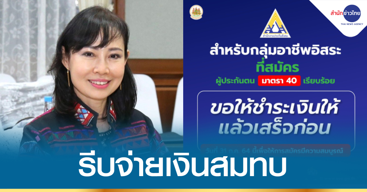 น.ส.ลัดดา แซ่ลี้ รองโฆษกสำนักงานประกันสังคม กระทรวงแรงงาน เปิดเผยว่า ตามที่สำนักงานประกันสังคม ได้เปิดรับสมัครบุคคลทั่วไปที่ประกอบอาชีพอิสระ เพื่อขึ้นทะเบียนเป็นผู้ประกันตนตามมาตรา 40 ตั้งแต่วันที่ 14 กรกฎาคม 2564 เป็นต้นมา พบว่ามีผู้ประกอบอาชีพอิสระให้ความสนใจสมัครเป็นผู้ประกันตนตามมาตรา 40 เป็นจำนวนมาก โดยสำนักงานประกันสังคม ขอแจ้งให้ทราบว่า เมื่อท่านได้สมัครเป็นผู้ประกันตนตามมาตรา 40 แล้ว สถานะความเป็นผู้ประกันตนจะสมบูรณ์ตามกฎหมายทันทีเมื่อท่านชำระเงิน จึงขอให้ผู้ที่สมัครขึ้นทะเบียนแล้ว รีบจ่ายเงินสมทบงวดแรกให้ทันภายในวันที่ 31 กรกฎาคม 2564 โดยสามารถชำระเงินผ่านช่องทางที่สะดวก ได้แก่ เคาน์เตอร์เซอร์วิส (7-11) เคาน์เตอร์เทสโก้โลตัส เคาน์เตอร์บิ๊กซี เคาน์เตอร์เซ็นเพย์ ธนาคารกรุงไทย จำกัด (มหาชน) ธนาคารกรุงศรีอยุธยา จำกัด (มหาชน) ธนาคารเพื่อการเกษตรและสหกรณ์การเกษตร หรือผ่าน Mobile Application ShoppyPay และตู้บุญเติม ฟรีค่าธรรมเนียมทุกช่องทาง