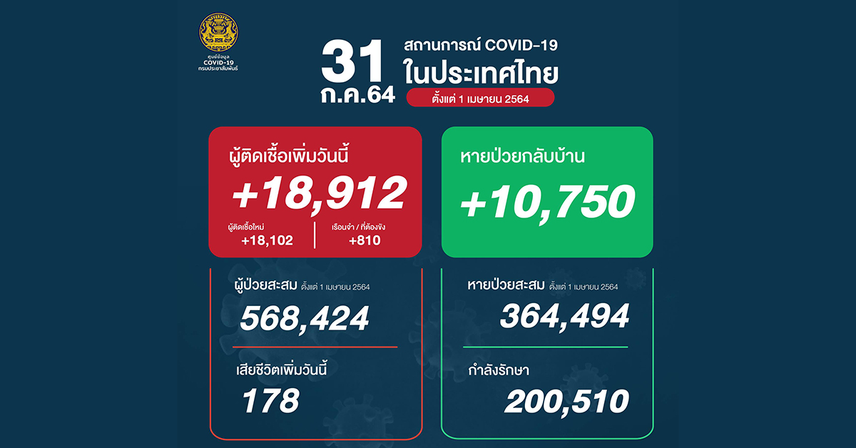 กรุงเทพฯ 31 ก.ค.- โควิดวันนี้ นิวไฮ ยอดติดเชื้อพุ่ง 18,912 ราย ยืนยันสะสม 568,424 ราย (ตั้งแต่ 1 เมษายน) หายป่วยกลับบ้าน 10,750 ราย เสียชีวิตอีก 178 ราย