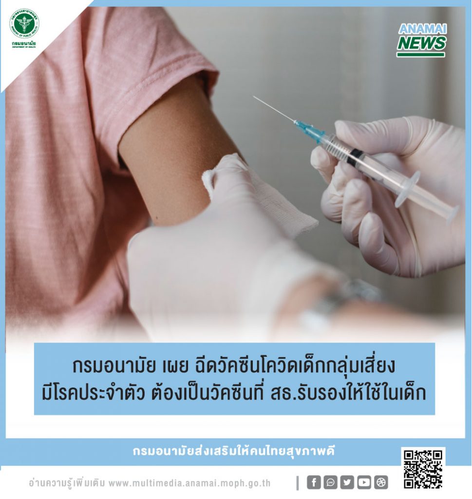 2) แนะนําให้ฉีดวัคซีนที่กระทรวงสาธารณสุขรับรองให้ใช้ในเด็ก ในกรณีผู้ป่วยเด็กที่มีโรคประจําตัวที่มีความเสี่ยงของโรคโควิด-19 ที่รุนแรง เช่น โรคอ้วน โรคทางเดินหายใจเรื้อรัง โรคหัวใจและหลอดเลือด โรคไตวายเรื้อรัง โรคหลอดเลือดสมอง โรคมะเร็งและภาวะภูมิคุ้มกันต่ำ และโรคเบาหวาน เป็นต้น