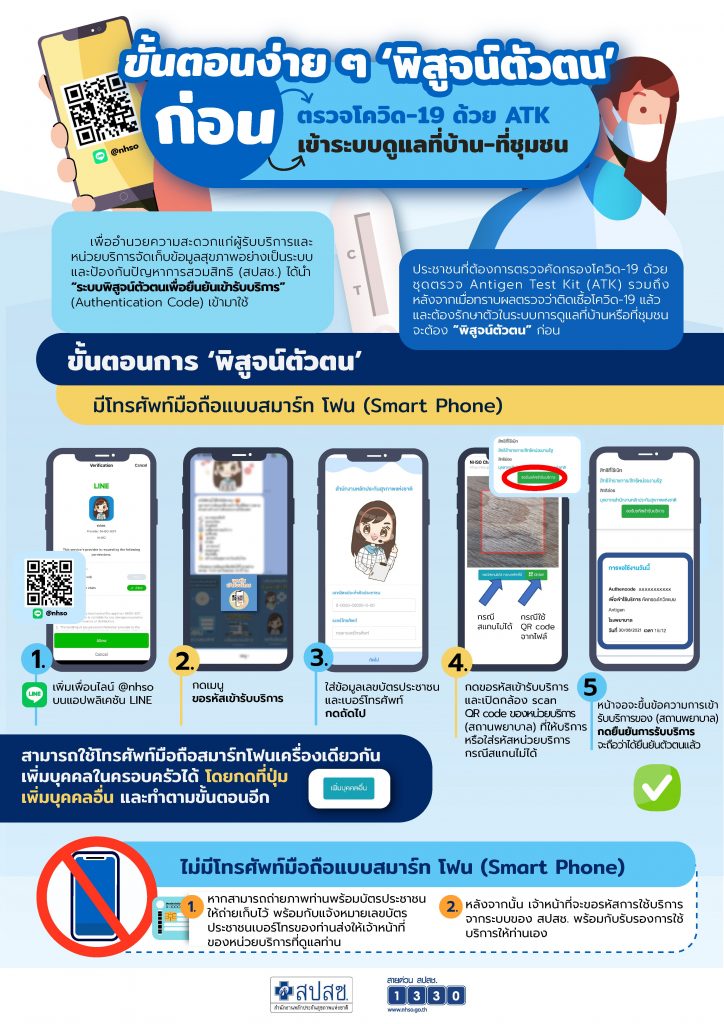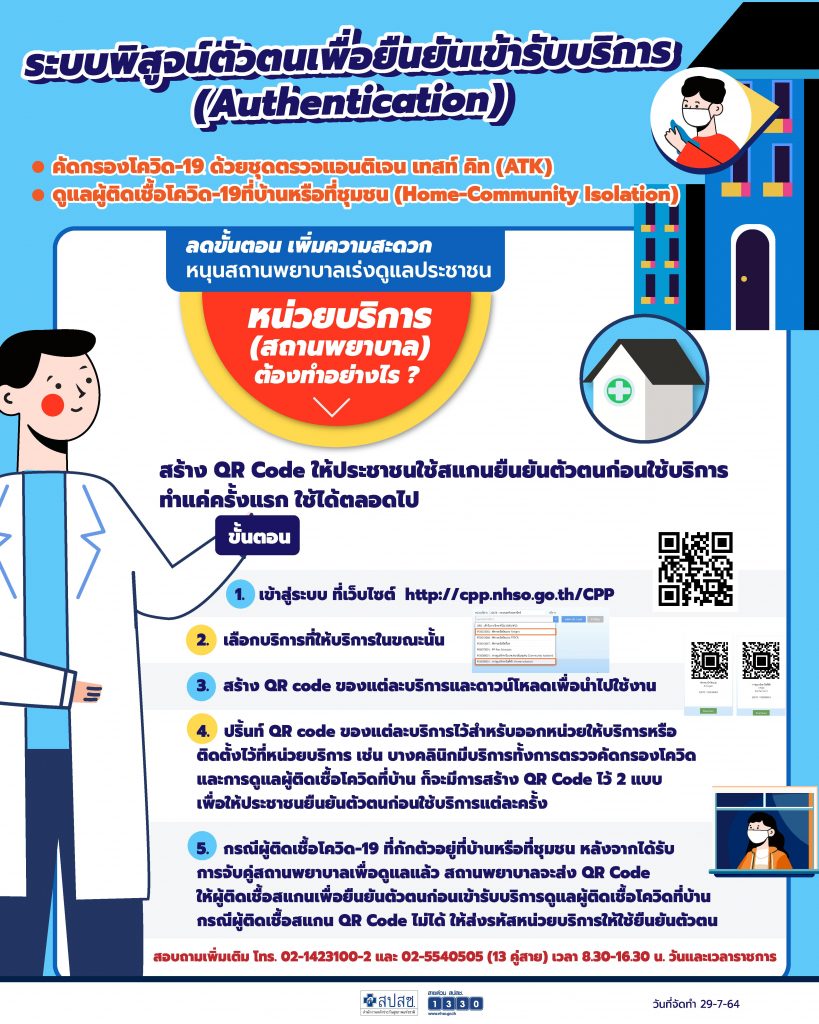 ทพ.อรรถพร ลิ้มปัญญาเลิศ รองเลขาธิการสำนักงานหลักประกันสุขภาพแห่งชาติ (สปสช.) ในฐานะโฆษก สปสช. กล่าวว่า ระบบการดูแลผู้ป่วยโควิด-19 ที่บ้านและในชุมชน (Home Isolation/Community Isolation : HI/CI) เป็นกลไกที่สำคัญในการดูแลผู้ติดเชื้อโควิด-19 กลุ่มที่ไม่มีอาการหรือมีอาการไม่มากในช่วงเวลานี้ แต่ด้วยผู้ติดเชื้อโควิด-19 ที่มีจำนวนมาก ที่เป็นผลจากประชาชนเข้าถึงบริการตรวจคัดกรองมาขึ้นจากการตรวจเชิงรุก จำเป็นต้องมีระบบที่เป็นการช่วยอำนวยความสะดวกในการรับบริการของผู้ติดเชื้อโควิด-19 และการให้บริการของหน่วยบริการ โดยลดขั้นตอนต่างๆ ที่ยุ่งยาก สปสช. จึงได้พัฒนาโดยนำ “ระบบพิสูจน์ตัวตนเพื่อยืนยันเข้ารับบริการ” (Authentication Code) มาใช้ในการบริการผู้ติดเชื้อโควิด-19 ที่กักตัวอยู่ที่บ้านหรือที่ชุมชน เพื่อได้รับการจับคู่ดูแลกับหน่วยบริการ ได้แก่ คลินิก ศูนย์บริการสาธารณสุข หรือโรงพยาบาลนั้น ทางเจ้าหน้าที่ของหน่วยบริการจะโทรไปถามเพื่อสอบถามและให้ยืนยันตัวตนก่อนการเข้ารับบริการ ซึ่งจะเป็นการยืนยันตัวตนแบบออนไลน์ โดยมีขั้นตอนดังนี้