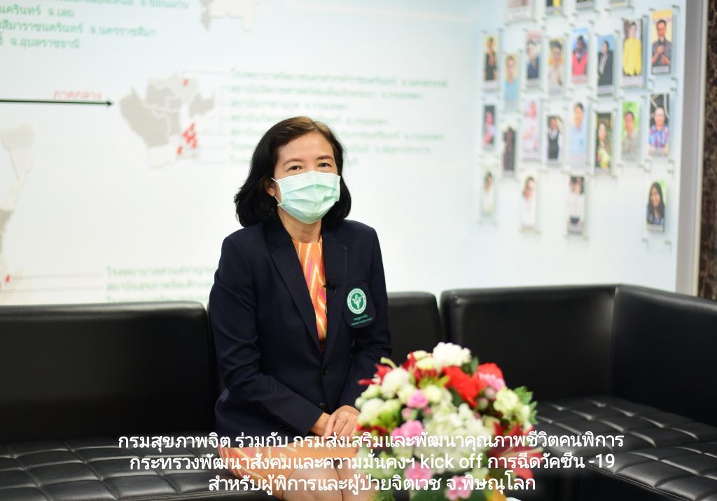 ที่โรงพยาบาลจิตเวชพิษณุโลก อ.วังทอง จ.พิษณุโลก แพทย์หญิงพรรณพิมล วิปุลากร อธิบดีกรมสุขภาพจิต พร้อมด้วยนายรณชัย จิตรวิเศษ ผู้ว่าราชการจังหวัดพิษณุโลก เป็นประธานในพิธีเปิดโครงการฉีดวัคซีนโควิด ให้ผู้พิการทุกประเภทที่อยู่ใน จ.พิษณุโลก จำนวน 10,000 คน ซึ่งเป็นความร่วมมือระหว่างกรมสุขภาพจิตกับกระทรวงพัฒนาสังคมและความมั่นคงของมนุษย์ โดยมีผู้บริหารกรมสุขภาพจิตประกอบด้วย นพ.สมัย ศิริทองถาวร รองอธิบดีกรมสุขภาพจิต นพ.กิตต์กวี โพธิ์โน ผอ.โรงพยาบาลสวนปรุง, นพ.ภานุ คูวุฒยากร, ผอ.รพ.จิตเวชพิษณุโลก, นายชูพงษ์ สังข์ผลิพันธ์ ผอ.ศูนย์สุขภาพจิตที่2 ร่วมพิธี โดยมีนางศิรทิพย์ ภาศรีสมบัติ พัฒนาสังคมและความมั่นคงของมนุษย์จังหวัดพิษณุโลก กล่าวรายงานความเป็นมาของโครงการ