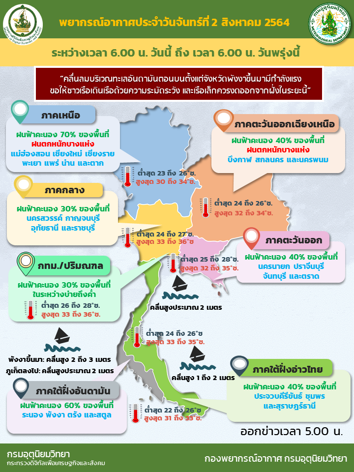 กรมอุตุนิยมวิทยา พยากรณ์อากาศ 24 ชั่วโมงข้างหน้า มรสุมตะวันตกเฉียงใต้กำลังค่อนข้างแรงพัดปกคลุมทะเลอันดามัน ประเทศไทย และอ่าวไทย ประกอบกับมีหย่อมความกดอากาศต่ำปกคลุมประเทศลาว และเวียดนามตอนบน ลักษณะเช่นนี้ทำให้ภาคเหนือ และภาคตะวันออกเฉียงเหนือ มีฝนตกหนักบางแห่ง ขอให้ประชาชนบริเวณดังกล่าวระวังอันตรายจากฝนตกหนักและฝนที่ตกสะสม ซึ่งอาจทำให้เกิดน้ำท่วมฉับพลันและน้ำป่าไหลหลากได้