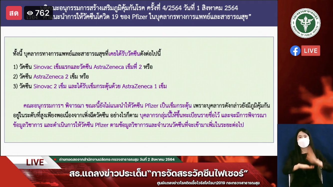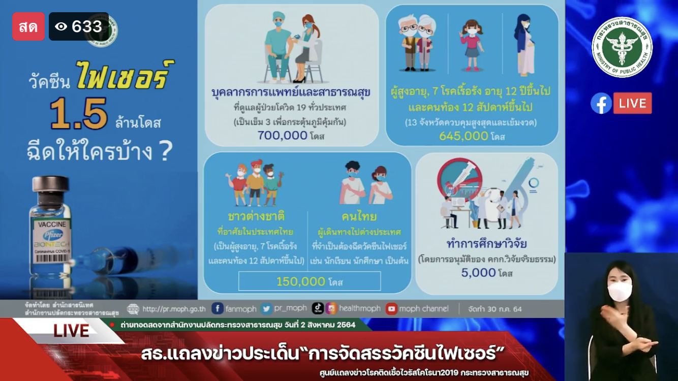 นพ.สุระ วิเศษศักดิ์ รองปลัดกระทรวงสาธารณสุข (รองปลัด สธ.) กล่าวว่า สรุปผลการประชุมคณะทำงานสร้างเสริมภูมิคุ้มกันโรค ในการจัดสรรวัคซีนโควิด-19 ที่มีการหารือเพื่ออัพเดทสถานการณ์โควิด โดยเห็นชอบการจัดสรรวัคซีนไฟเซอร์ ล็อตบริจาคจากสหรัฐอเมริกา จำนวน 1.5 ล้านโดส ให้กับกลุ่มบุคลากรการแพทย์ แบ่งเป็น 4 กลุ่ม ได้แก่