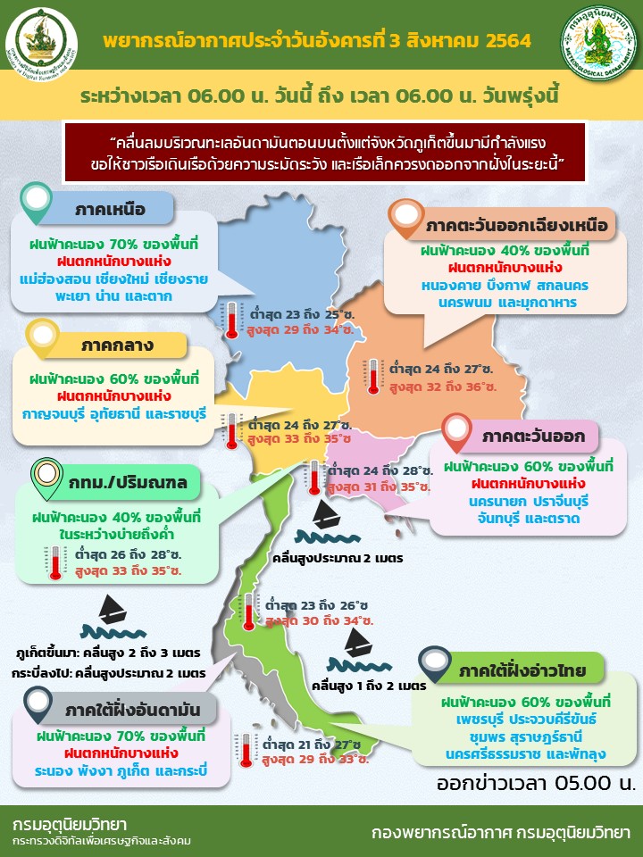 กรมอุตุนิยมวิทยา พยากรณ์อากาศ 24 ชั่วโมงข้างหน้า มรสุมตะวันตกเฉียงใต้กำลังค่อนข้างแรงพัดปกคลุมทะเลอันดามัน ประเทศไทย และอ่าวไทย ประกอบกับร่องมรสุมพาดผ่านประเทศเมียนมา ตอนบนของภาคเหนือ ประเทศลาว และเวียดนามตอนบน เข้าสู่หย่อมความกดอากาศต่ำกำลังแรงบริเวณชายฝั่งประเทศจีนตอนใต้ ลักษณะเช่นนี้ทำให้ภาคเหนือ ภาคตะวันออกเฉียงเหนือ ภาคกลาง ภาคตะวันออก และภาคใต้ฝั่งตะวันตก มีฝนตกหนักบางแห่ง ขอให้ประชาชนบริเวณดังกล่าวระวังอันตรายจากฝนตกหนักและฝนที่ตกสะสม ซึ่งอาจทำให้เกิดน้ำท่วมฉับพลันและน้ำป่าไหลหลากได้