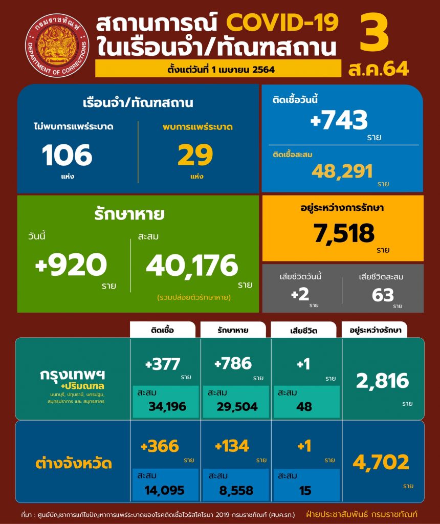 นายอายุตม์ สินธพพันธุ์ อธิบดีกรมราชทัณฑ์ เปิดเผยถึงสถานการณ์การแพร่ระบาดของโรคติดเชื้อไวรัสโควิด-19 ในเรือนจำและทัณฑสถาน (ข้อมูล ณ วันที่ 2 สิงหาคม 2564 เวลา 16.00 น.) พบผู้ติดเชื้อรายใหม่ 743 ราย (พบในเรือนจำสีแดง 669 ราย และพบในห้องแยกกักโรคผู้ต้องขังรับใหม่ 74 ราย) รักษาหายเพิ่ม 920 ราย เสียชีวิต 2 ราย รวมมีผู้ติดเชื้อที่ยังอยู่ในการดูแลของกรมราชทัณฑ์ 7,518 ราย (กลุ่มสีเขียว 81% สีเหลือง 18.6% และสีแดง 0.4%) เป็นพื้นที่กรุงเทพมหานคร 846 ราย ปริมณฑล 1,970 ราย และต่างจังหวัด 4,702 ราย