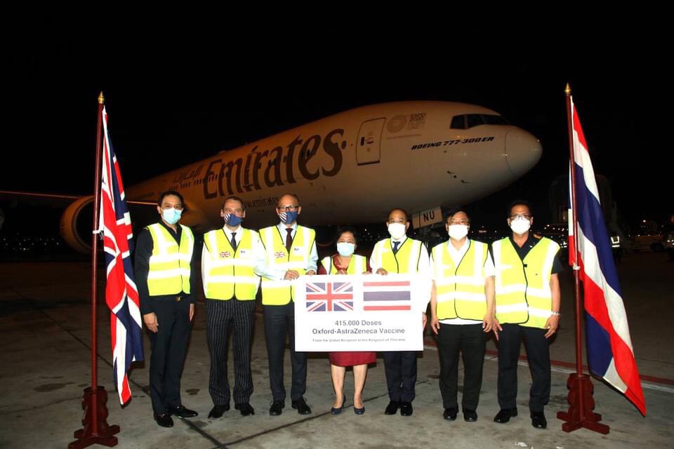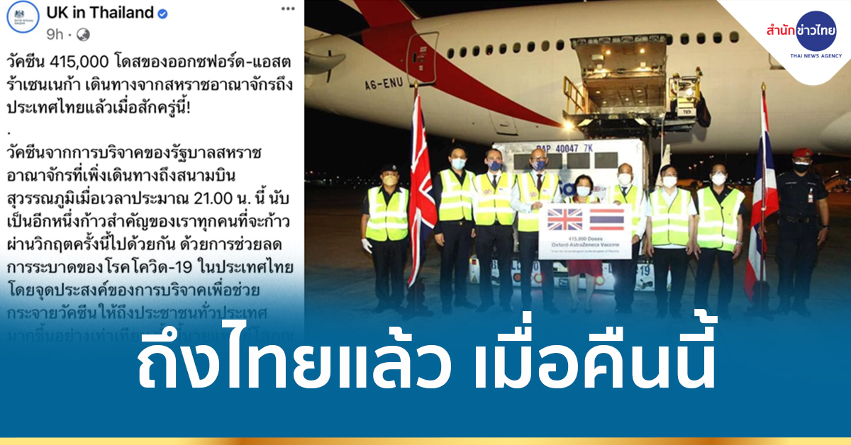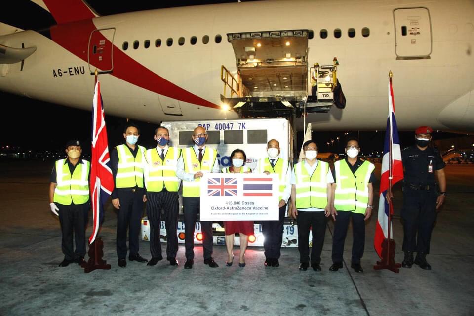 เพจเฟซบุ๊ก UK in Thailand ของสถานเอกอัครราชทูตอังกฤษประจำประเทศไทย โพสต์ว่า วัคซีน 415,000 โดสของออกซฟอร์ด-แอสตราเซเนกา เดินทางจากสหราชอาณาจักรถึงประเทศไทยแล้ว