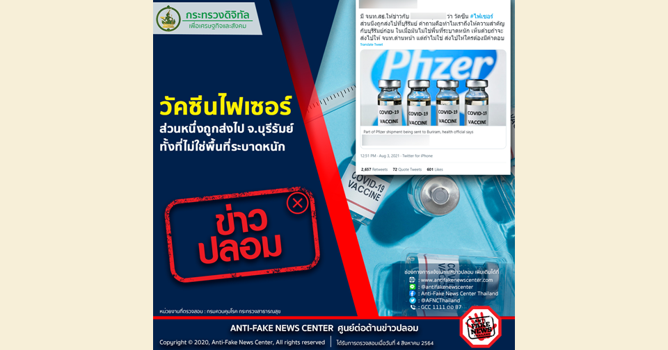 ANTI-FAKE NEWS CENTER ศูนย์ต่อต้านข่าวปลอม กระทรวงดิจิทัลเพื่อเศรษฐกิจและสังคม (ดีอีเอส) แจ้งผ่านไลน์ออฟฟิเชียล ว่า ตามที่ได้มีการเผยแพร่ข่าวสารถึงประเด็นเรื่อง วัคซีนไฟเซอร์ส่วนหนึ่งถูกส่งไป จ.บุรีรัมย์ ทั้งที่ไม่ใช่พื้นที่ระบาดหนัก ทางศูนย์ต่อต้านข่าวปลอมได้ตรวจสอบข้อเท็จจริงกับ กรมควบคุมโรค กระทรวงสาธารณสุข พบว่าข้อมูลดังกล่าวนั้น เป็นข้อมูลเท็จ