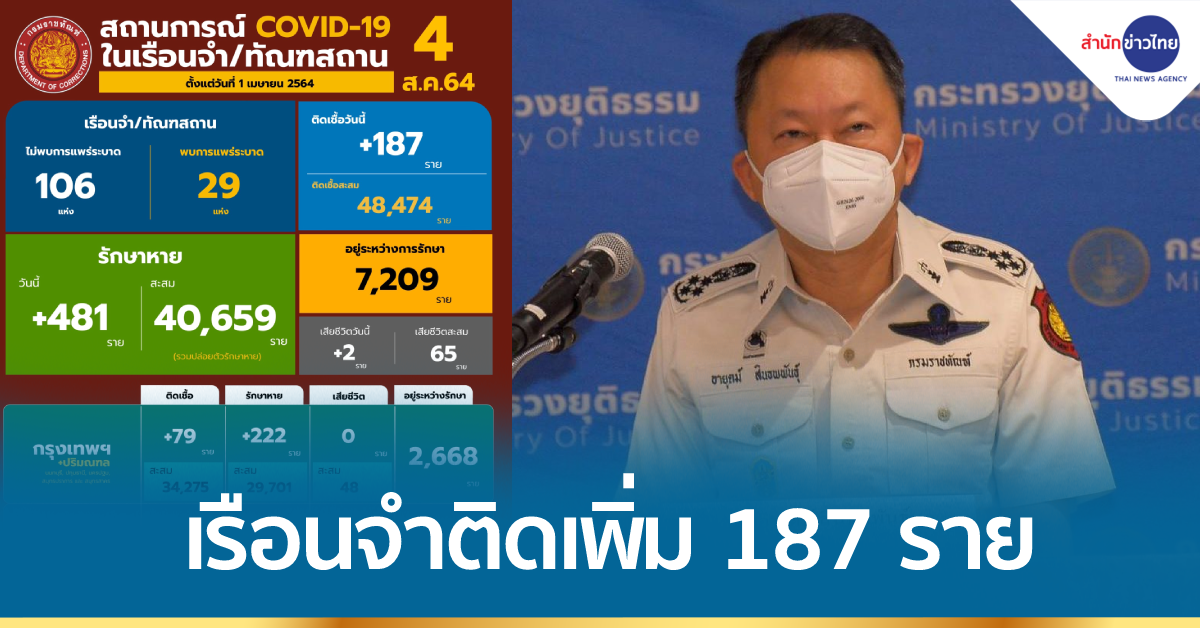 นายอายุตม์ สินธพพันธุ์ อธิบดีกรมราชทัณฑ์ เปิดเผยถึงสถานการณ์การแพร่ระบาดของโรคติดเชื้อไวรัสโควิด-19 ในเรือนจำและทัณฑสถาน (ข้อมูล ณ วันที่ 3 สิงหาคม 2564 เวลา 16.00 น.) พบผู้ติดเชื้อรายใหม่ 187 ราย (พบในเรือนจำสีแดง 165 ราย และพบในห้องแยกกักโรคผู้ต้องขังรับใหม่ 22 ราย) รักษาหายเพิ่ม 481 ราย เสียชีวิต 2 ราย รวมมีผู้ติดเชื้อที่ยังอยู่ในการดูแลของกรมราชทัณฑ์ 7,209 ราย (กลุ่มสีเขียว 81.5% สีเหลือง 18.1% และสีแดง 0.4%) เป็นพื้นที่กรุงเทพมหานคร 651 ราย ปริมณฑล 2,017 ราย และต่างจังหวัด 4,541 ราย