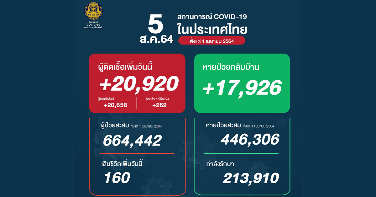 EOC กระทรวงสาธารณสุข รายงานสถานการณ์การติดเชื้อโควิด-19 รายใหม่ วันนี้ (5 ส.ค.) พบยอดผู้ติดเชื้อใหม่รวม 20,920 ราย จำแนกเป็นติดเชื้อใหม่ 20,658 ราย ติดเชื้อภายในเรือนจำ/ที่ต้องขัง 262 ราย ยืนยันสะสม 664,442 ราย (ตั้งแต่ 1 เมษายน) หายป่วยกลับบ้าน 17,926 ราย มีผู้เสียชีวิตเพิ่ม 160 ราย ทั้งนี้ เวลา 12.30 น. ศบค. จะแถลงรายละเอียดอย่างเป็นทางการอีกครั้ง .-สำนักข่าวไทย