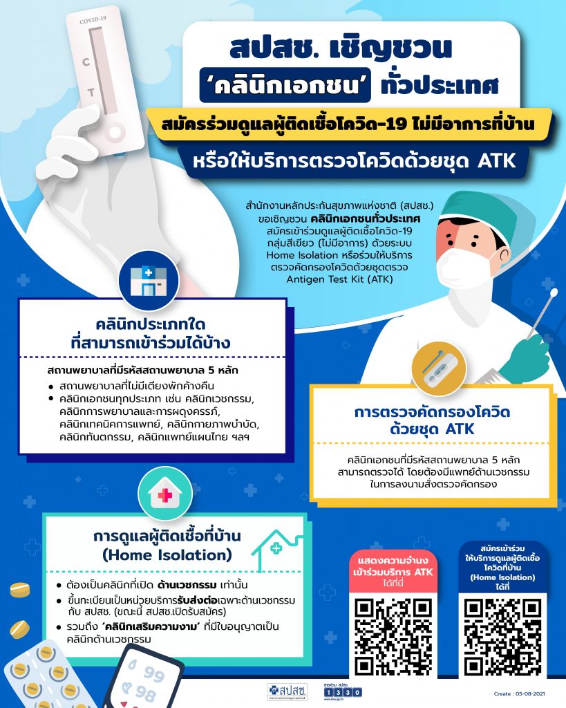 สปสช.6 ส.ค.-สปสช.เปิดรับสมัครคลินิกเอกชนทั่วประเทศเข้าร่วมดูแลผู้ติดเชื้อโควิด-19 ที่บ้าน และร่วมให้บริการตรวจคัดกรองโควิดด้วยชุด ATK คลินิกทุกประเภทรวมคลินิกทันตกรรมเข้าร่วมบริการตรวจโควิด-19 ด้วยชุด ATK ได้ แต่ต้องมีแพทย์ด้านเวชกรรมในการลงนามสั่งตรวจคัดกรอง ขณะบริการดูแลผู้ติดเชื้อโควิด-19 ที่บ้าน ต้องเป็นคลินิกเวชกรรม ส่วนคลินิกเสริมความงามก็สามารถร่วมให้บริการได้หากจดทะเบียนเป็นคลินิกเวชกรรมด้วย