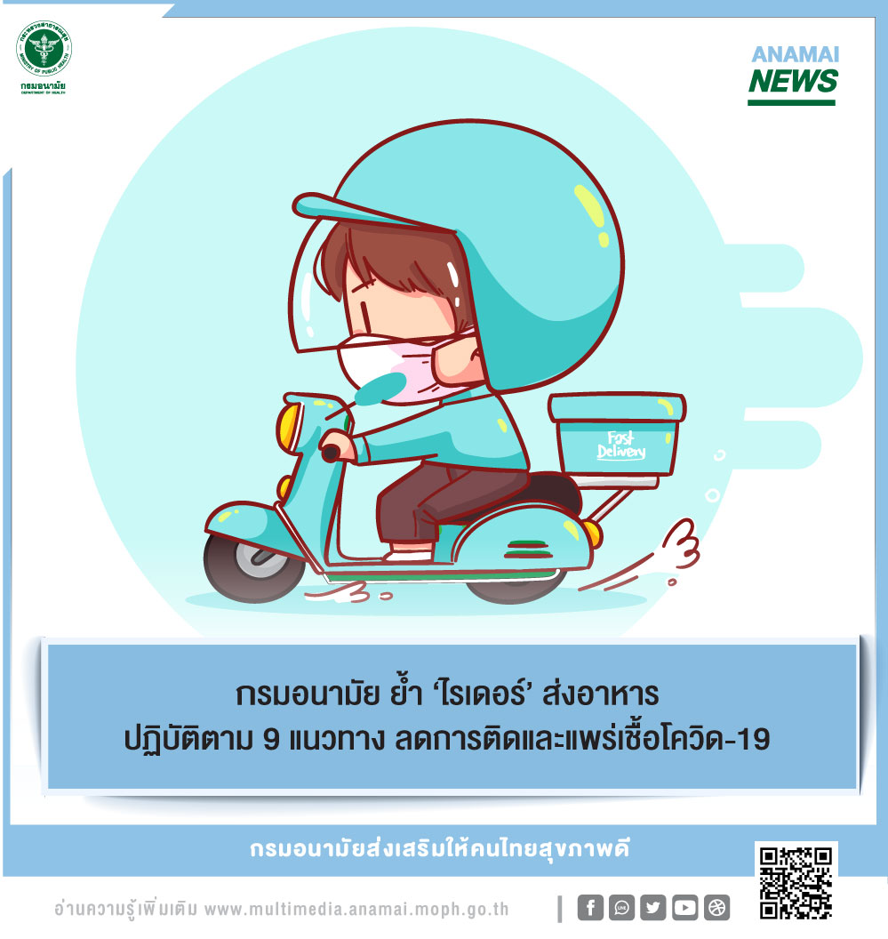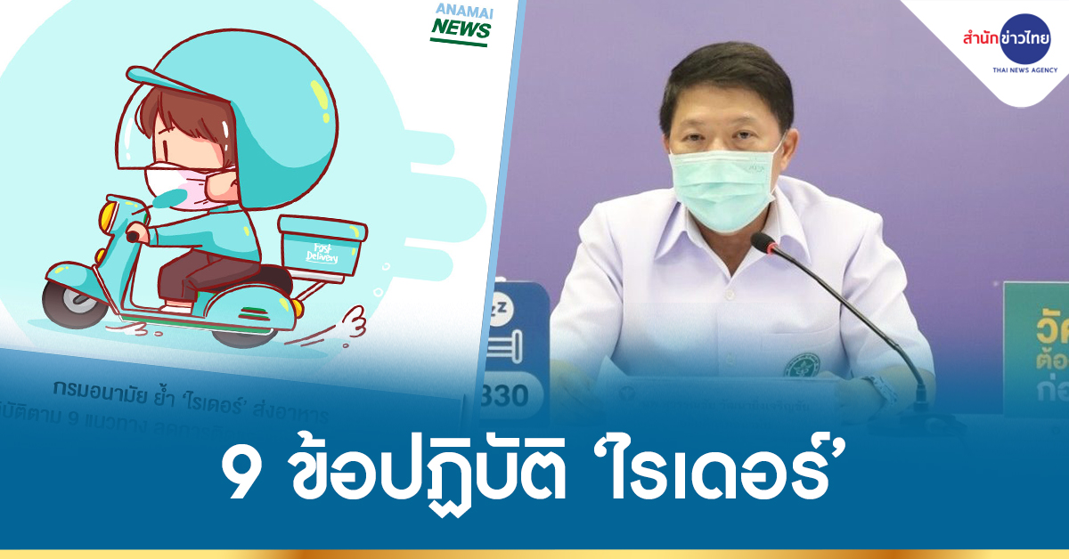 นพ.สุวรรณชัย วัฒนายิ่งเจริญชัย อธิบดีกรมอนามัย กระทรวงสาธารณสุข กล่าวว่า จากสถานการณ์การแพร่ระบาด ของโควิด-19 ที่แพร่กระจายเป็นวงกว้างในขณะนี้ ความนิยมในธุรกิจการสั่งอาหารหรือเครื่องดื่มแบบเดลิเวอรี มีมากขึ้น ส่วนหนึ่งมาจากการปรับเปลี่ยนรูปแบบการใช้ชีวิตและการทำงานที่ต้องอยู่กับบ้าน ซึ่งจากข้อมูลของศูนย์วิจัยกสิกรไทยได้ประเมินในปี 2563 พบว่ามีบริการส่งอาหาร 66 – 68 ล้านครั้งต่อปี และในช่วงการแพร่ระบาดของโควิด-19 จะเพิ่มขึ้นปีละกว่าร้อยละ 70 จากตัวเลขดังกล่าวแสดงให้เห็นถึงจำนวนการใช้บริการเดลิเวอรีที่เพิ่มมากขึ้นอย่างต่อเนื่อง อีกทั้งสถานการณ์ช่วงนี้ผู้ขนส่งอาหาร (Rider) ในฐานะคนกลางสำหรับการส่งต่ออาหารจากร้านค้าไปยังผู้บริโภคต้องคุมเข้มความปลอดภัย เพื่อลดความเสี่ยงในการติดและแพร่กระจายเชื้อโควิด-19 โดยขอให้ผู้ขนส่งอาหาร (Rider) ยึดมาตรการทั้ง 9 แนวทาง ดังนี้
