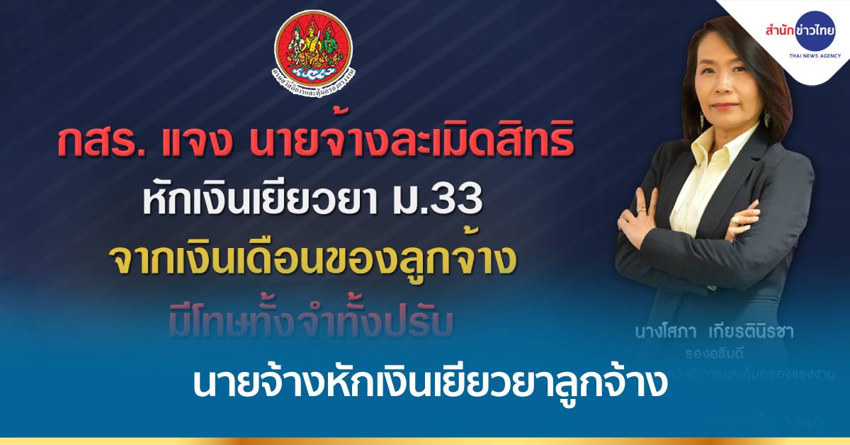 กทม. 7 ส.ค.-กสร. แจงประเด็นในสื่อออนไลน์ กรณีนายจ้างหักเงินเยียวยาที่ลูกจ้างได้รับสิทธิจากการเป็นผู้ประกันตน มาตรา 33 เป็นเหตุให้ลูกจ้างขาดรายได้ที่ควรได้รับ จำนวน 2,500 บาท ถือว่านายจ้างละเมิดสิทธิ มีโทษทั้งจำทั้งปรับ