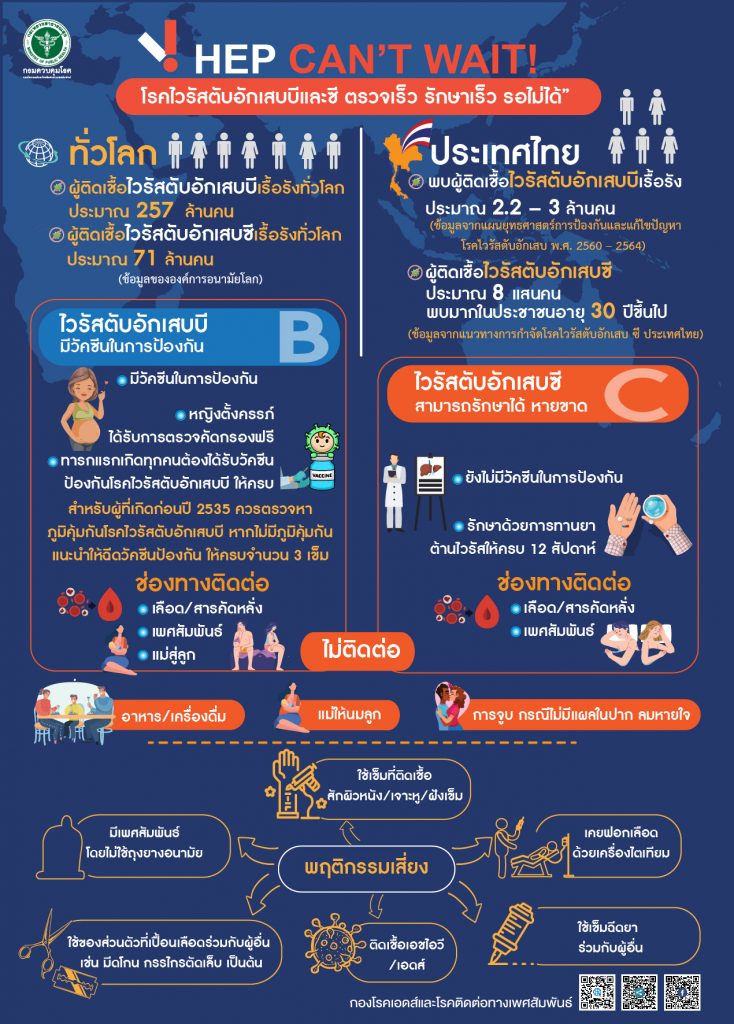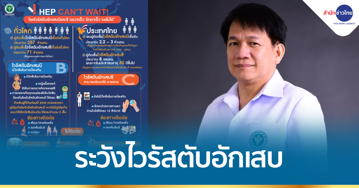 กรมควบคุมโรค กระทรวงสาธารณสุข เตือนประชาชนระวังภัยเงียบจากการติดเชื้อไวรัสตับอักเสบบีและซี ซึ่งสามารถถ่ายทอดเชื้อสู่ผู้อื่นได้ และนำไปสู่ภาวะตับแข็งหรือมะเร็งตับได้ โดยโรคดังกล่าวยังเป็นปัญหาสำคัญในประเทศไทยและในระดับนานาชาติ หากประชาชนมีพฤติกรรมเสี่ยงขอให้เข้ารับบริการตรวจคัดกรองและรับการรักษาโดยเร็ว พร้อมตั้งเป้ากำจัดโรคไวรัสตับอักเสบบีและซีให้หมดไปภายในปี 2573