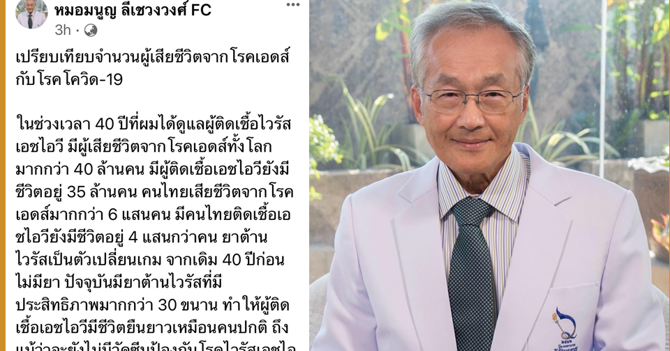 นพ.มนูญ ลีเชวงวงศ์ หัวหน้าโรคระบบทางเดินหายใจ โรงพยาบาลวิชัยยุทธ โพสต์ข้อความผ่านเฟซบุ๊ก “หมอมนูญ ลีเชวงวงศ์ FC” เปรียบเทียบจำนวนผู้เสียชีวิตจากโรคเอดส์กับโรคโควิด-19