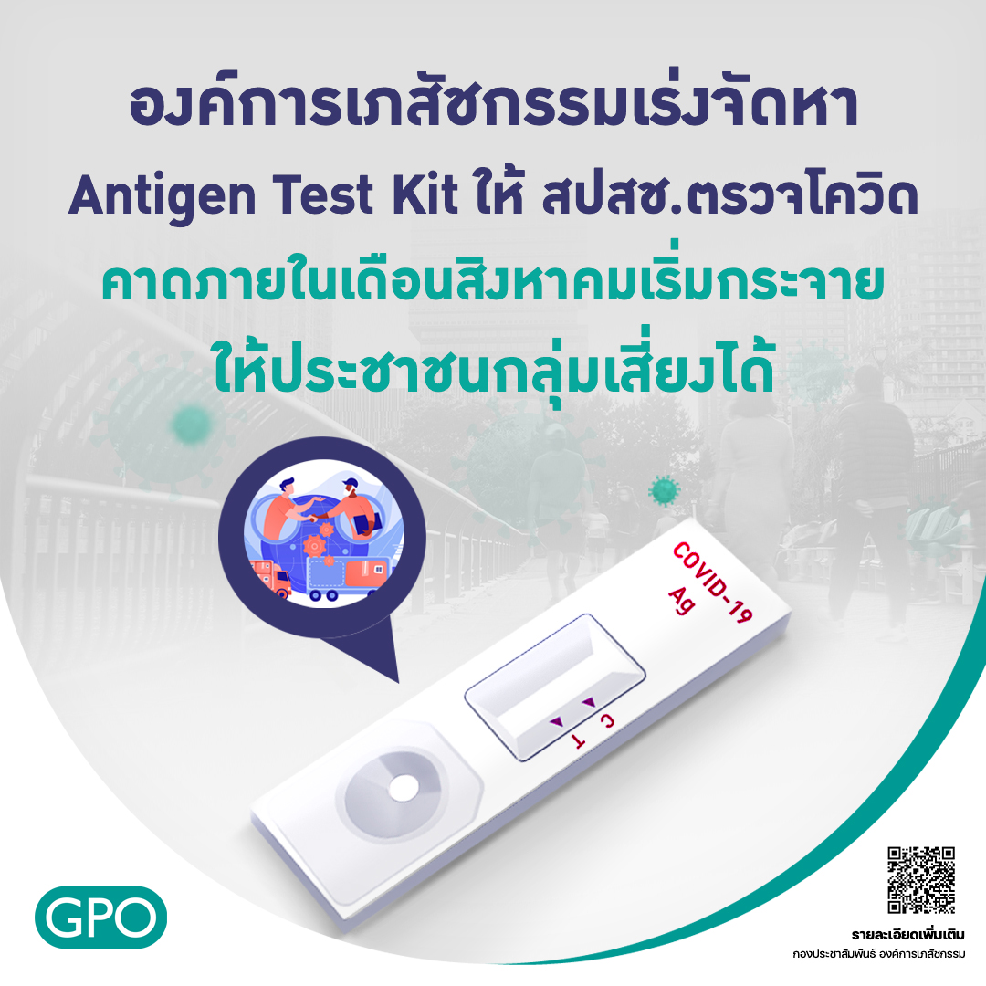 อภ.9 ส.ค.- องค์การเภสัชกรรมเร่งจัดหา Antigen Test Kit ให้ สปสช.ตรวจโควิด คาดภายในเดือนสิงหาคมเริ่มกระจายให้ประชาชนกลุ่มเสี่ยงได้