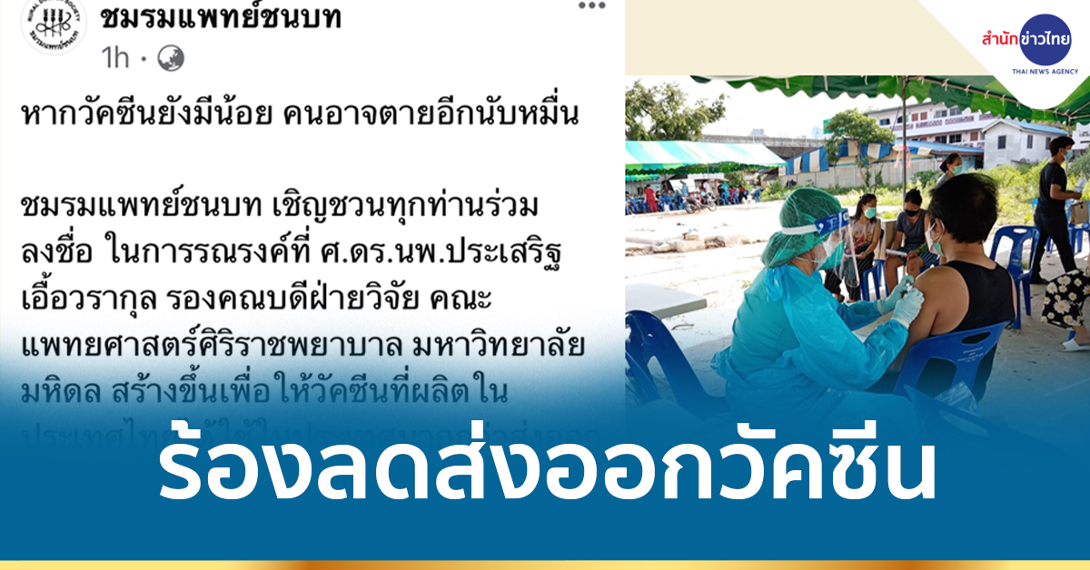 กรุงเทพฯ 9 ส.ค.- แพทย์ชนบท ชวนร่วมลงชื่อ เรียกร้องให้รัฐบาลใช้ พ.ร.บ.ความมั่นคงด้านวัคซีนฯ ลดการส่งออกวัคซีนไปต่างประเทศ