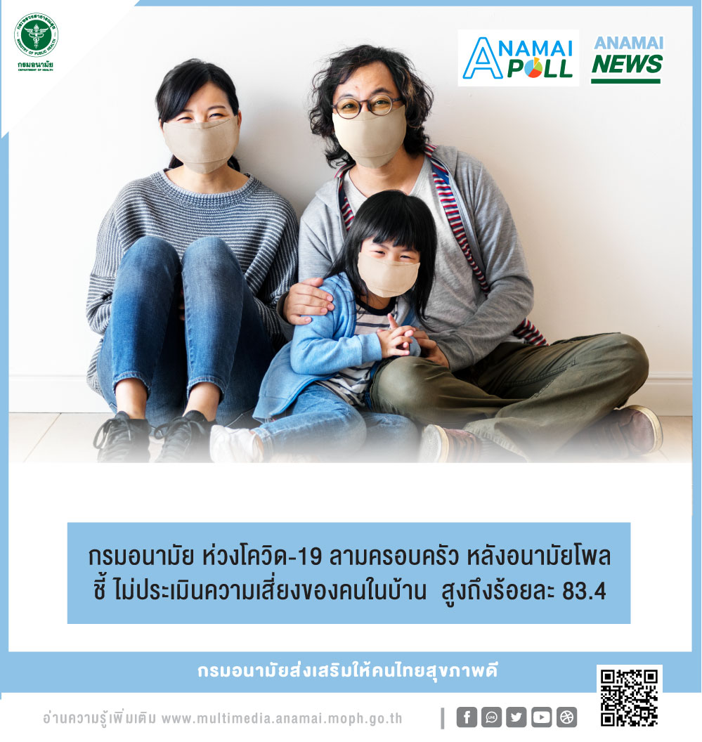 นพ.สุวรรณชัย วัฒนายิ่งเจริญชัย อธิบดีกรมอนามัย กระทรวงสาธารณสุข กล่าวว่า สถานการณ์การแพร่ระบาดของโรคโควิด-19 ยังคงมีความรุนแรงอย่างต่อเนื่อง โดยส่วนใหญ่พบมีการติดเชื้อกันเองภายในครอบครัวร้อยละ 20 มีการติดเชื้อกันภายในชุมชนร้อยละ 20 และจากข้อมูลการเสียชีวิตของผู้ป่วยในช่วง 14 วันที่ผ่านมา พบผู้เสียชีวิตติดเชื้อในครอบครัว ร้อยละ 18 ติดจากเพื่อนบ้านในชุมชน ร้อยละ 23 และติดจากการเดินทางไปพื้นที่เสี่ยงหรืออยู่ในพื้นที่เสี่ยง ร้อยละ 51 อีกทั้งจากผลสำรวจอนามัยโพลประเด็น “การประเมินความเสี่ยงและพฤติกรรมการป้องกันโรคของครอบครัว” ระหว่างวันที่ 19 ก.ค.–4 ส.ค.64 พบว่า คนในครอบครัวไม่มีการประเมินความเสี่ยงของสมาชิกในบ้าน เช่น ไม่มีการสังเกตอาการเบื้องต้น ตรวจวัดอุณหภูมิ หรือไม่ใช้แอปพลิเคชัน ไทยเซฟไทย เป็นต้น สูงถึงร้อยละ 83.4 สำหรับในพื้นที่ควบคุมสูงสุดและเข้มงวด พบว่า ประชาชนไม่มีการประเมินความเสี่ยงของคนในบ้าน ร้อยละ 67.5 ส่วนพฤติกรรมการป้องกัน โรคโควิด-19 ในบ้านที่ประชาชนเห็นด้วยและสามารถทำได้มากที่สุดคือ การแยกกันกินเมื่ออยู่ในบ้าน ร้อยละ 53.1 รองลงมาคือ การเว้นระยะห่าง ร้อยละ 50.1 และการสวมหน้ากากในบ้านตลอดเวลา ร้อยละ 49.9 ตามลำดับ