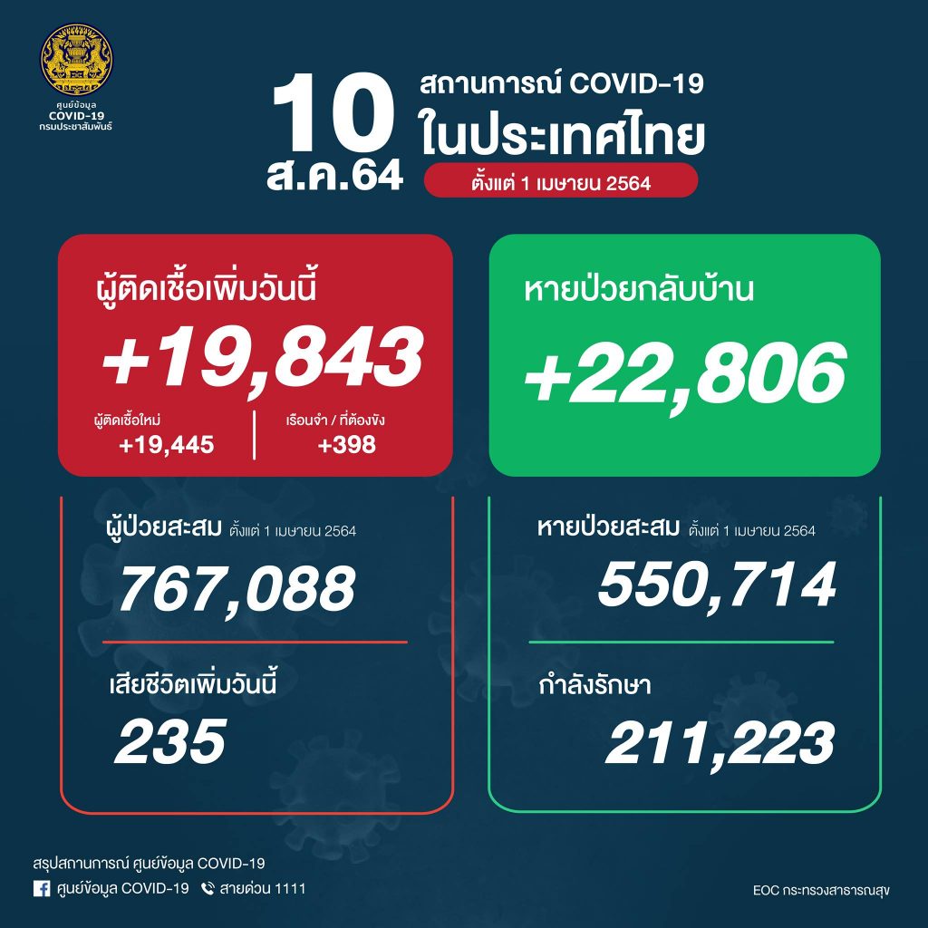 สถานการณ์โควิด-19 วันนี้ ศบค. รายงานพบผู้ติดเชื้อเพิ่มอีก 19,843 คน เป็นผู้ติดเชื้อรายใหม่ 19,445 คน ติดเชื้อในเรือนจำ 398 คน ส่วนผู้เสียชีวิต นิวไฮ 235 คน และหายป่วยกลับบ้านได้ 22,806 คน ผู้ป่วยกำลังรักษา 211,223 คน รวมผู้ติดเชื้อสะสมในการระบาดระลอกเมษายน 767,088 คน