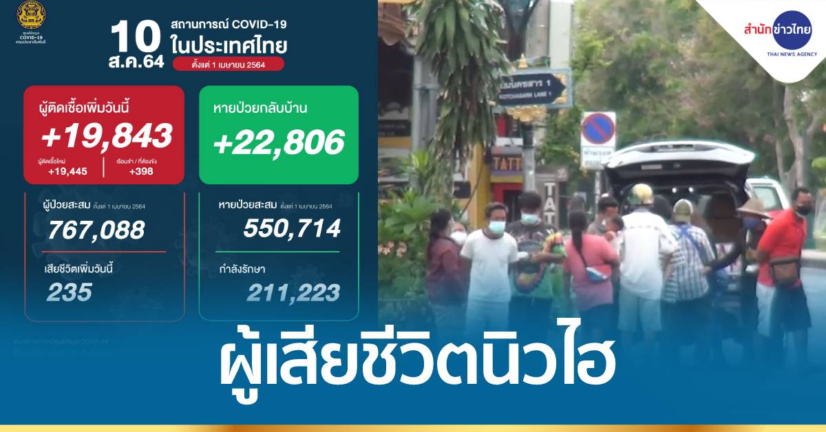 กทม. 10 ส.ค.-โควิดวันนี้ ผู้เสียชีวิต นิวไฮ 235 คน ผู้ติดเชื้อ 19,843 คน คณะกรรมการโรคติดต่อ จ.เชียงใหม่ มีคำสั่ง หากจะนำอาหารมาแจกตามทางสาธารณะ ต้องได้รับอนุญาตจาก อปท. ก่อน เพื่อจัดระเบียบผู้เข้ารับของบริจาค