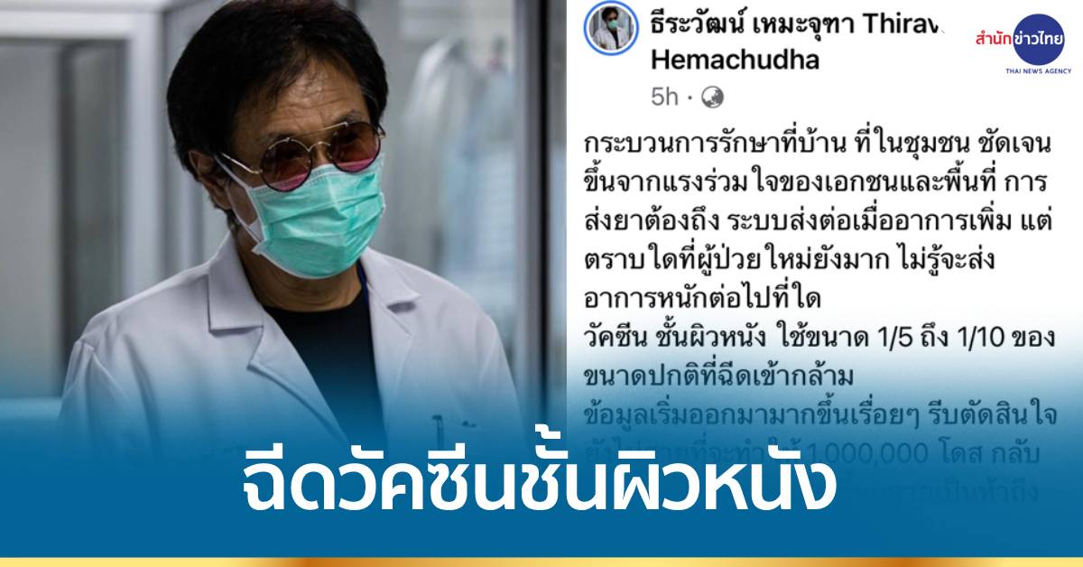 กทม. 10 ส.ค.-“หมอธีระวัฒน์” แนะรีบตัดสินใจยังไม่สาย ฉีดวัคซีนโควิดเข้าชั้นผิวหนัง ใช้ขนาด 1ส่วน5 ถึง 1ส่วน10 ของขนาดปกติที่ฉีดเข้ากล้าม จะทำให้ 1ล้านโดส กลายเป็น 5–10 ล้านโดส และถ้าฉีดแบบวัคซีนพิษสุนัขบ้า วันที่ 0 , 3 และ 7 ควรจะได้ภูมิคุ้มกันเริ่มขึ้นในวันที่ 10-14