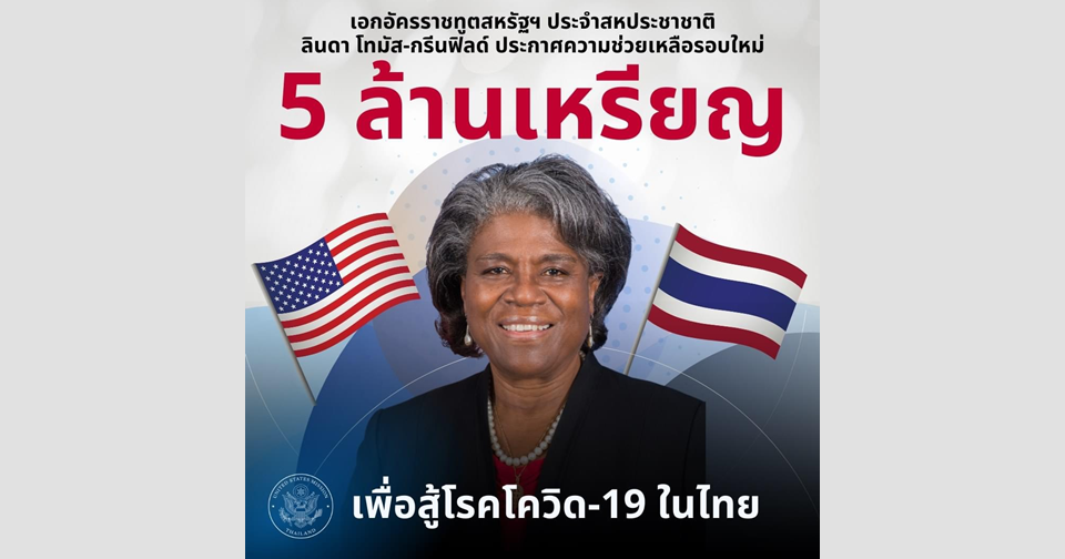 เพจสถานทูตสหรัฐประจำประเทศไทย U.S.Embassy Bangkok โพสต์วันนี้ (10 ส.ค.) ว่า วันนี้เอกอัครราชทูตสหรัฐฯ ประจำสหประชาชาติ ลินดา โทมัส-กรีนฟิลด์ ประกาศความช่วยเหลือด้านโรคโควิด-19 รอบใหม่ มูลค่า 5 ล้านเหรียญสหรัฐ ให้กับไทย ซึ่งจะช่วยสนับสนุนบุคลากรสาธารณสุขที่ให้บริการฉีดวัคซีนกับประชาชน ตลอดจนเสริมสร้างศักยภาพระบบสาธารณสุขของไทยในการป้องกัน ตรวจหา และตอบสนองต่อโรคโควิด-19 https://th.usembassy.gov/th/081021-usun-ltg-remarks-th/